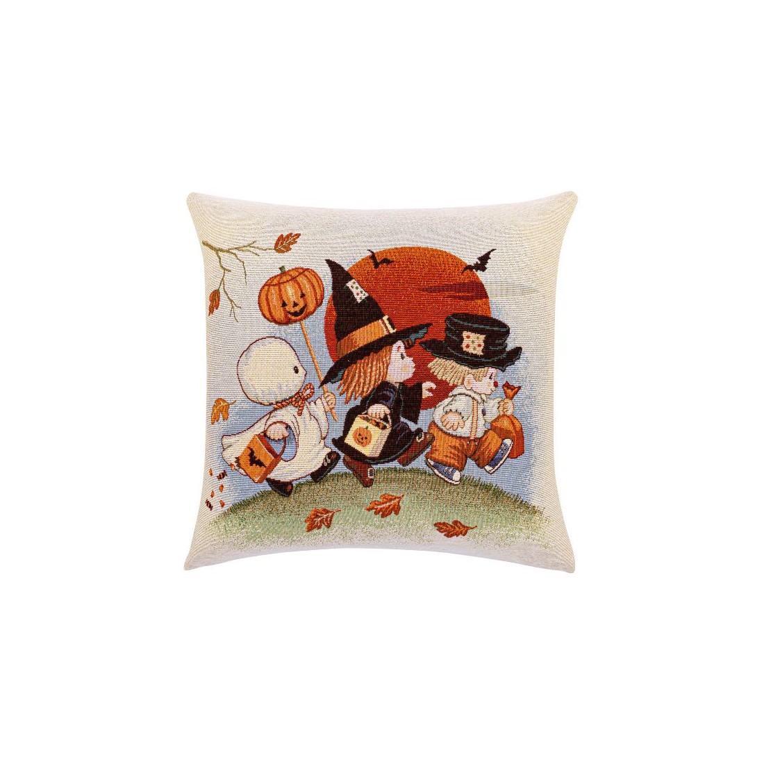 Jacquard cushion cover with a Halloween theme, featuring three children in costumes, highlighting the orange tone. CASPER. Zipper closure. Washable.