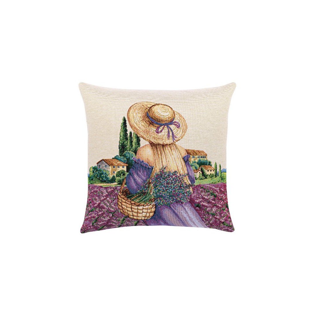 Jacquard cushion cover with a landscape of lavender fields and a girl, highlighting the violet color. VAUCLUSE. Zipper closure. Washable