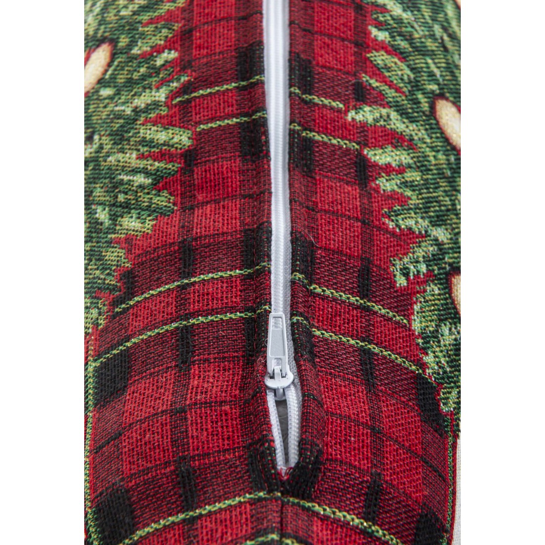 Jacquard cushion cover with a Christmas Tree decorated with golden baubles and red ribbons. Border with red and black checks. Washable. SAPIN