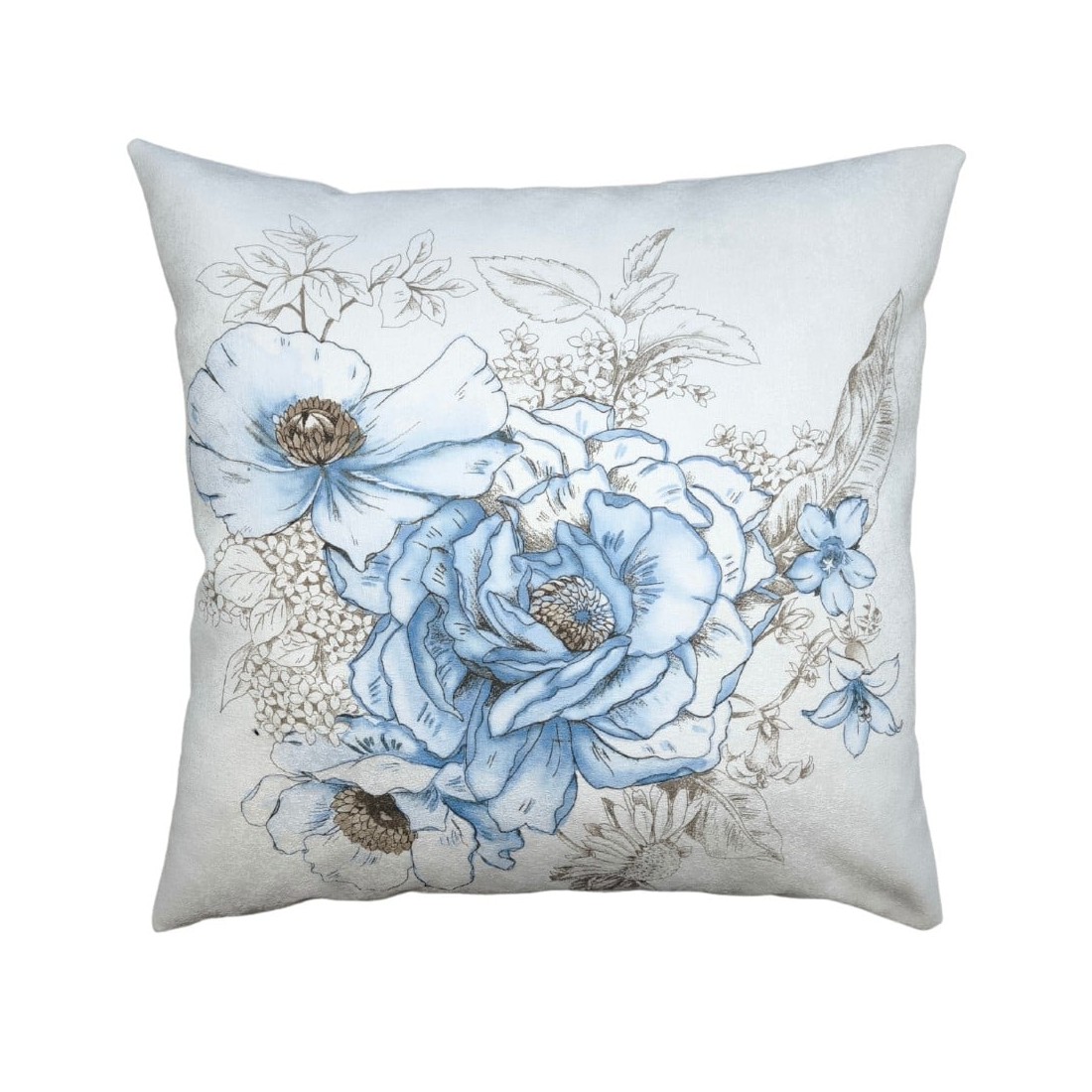 Printed cushion with blue flowers and feather-drawn leaves 45x45 LILY C.3