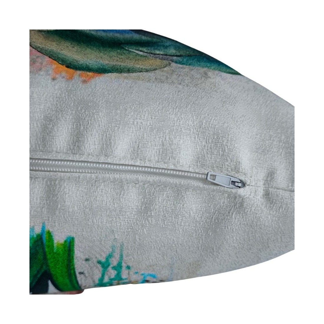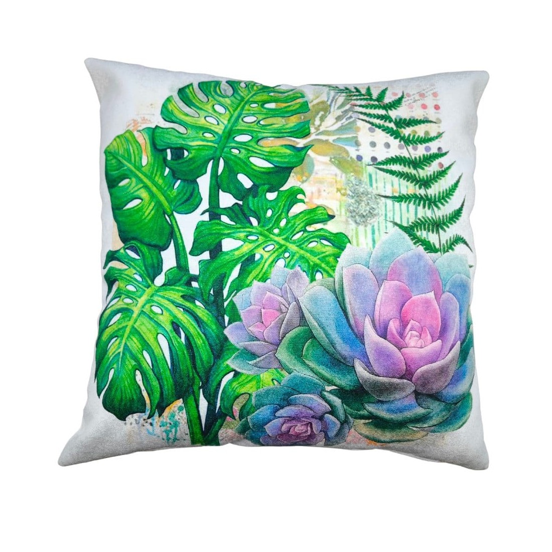 Cushion cover with tropical plants, succulents, and ferns in green and turquoise blue tones. Zipper closure. Washable. ARTEMISA