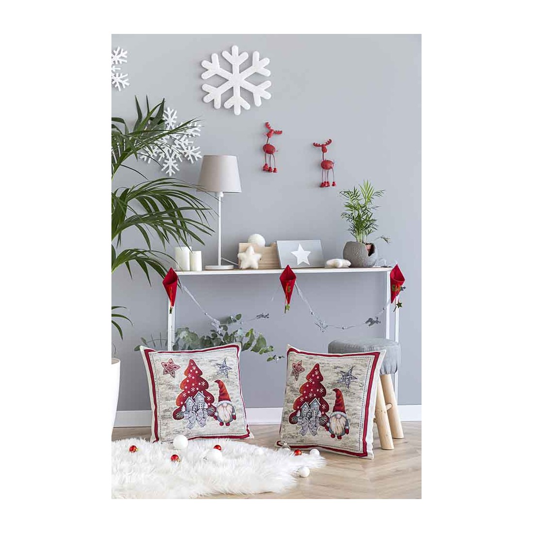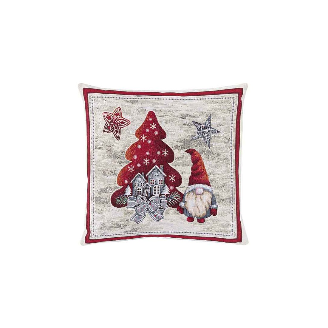 Jacquard cushion cover with a Christmas gnome featuring stars and a red Christmas tree. The tones of this cushion are a grey background with red motifs. Zipper closure. Washable.