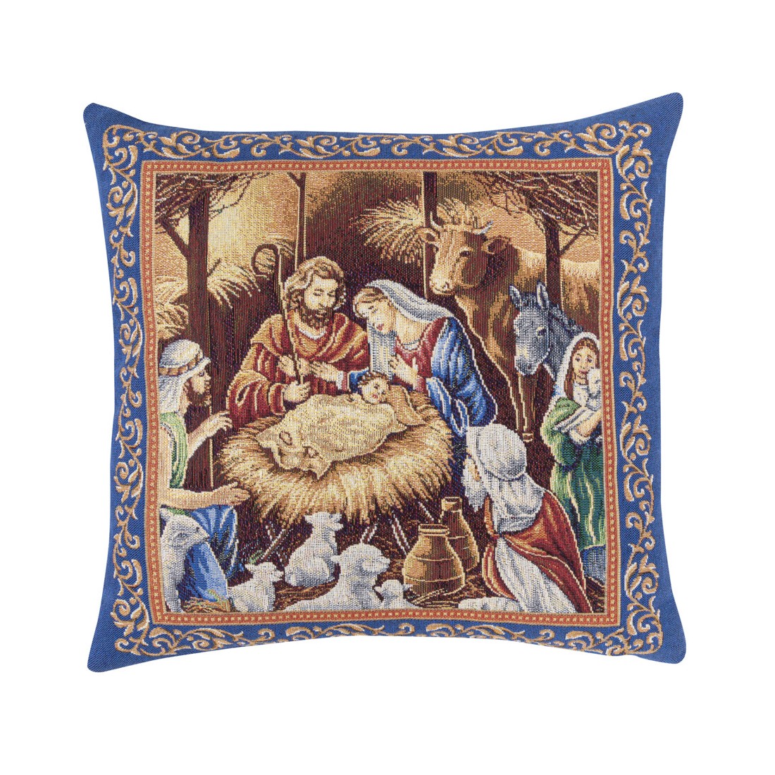 Jacquard cushion cover with the image of the Nativity of Jesus and the adoration of the shepherds on a blue background with a golden ornamental border. Zipper closure. NATIVIDAD C.21