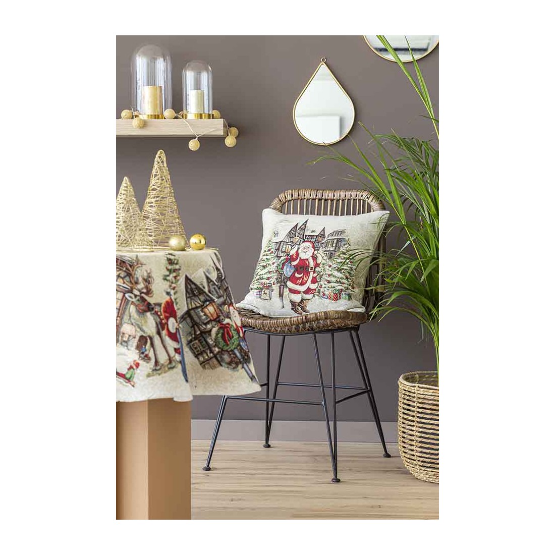 Jacquard cushion cover with Santa Claus in a Christmas village. In beige and golden tones. Zipper closure. Washable.