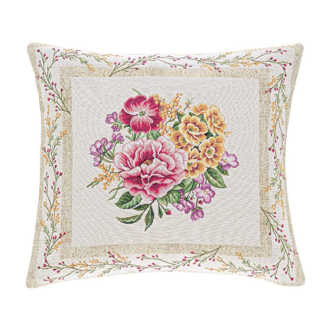 Jacquard cushion cover with a central bouquet of elegant pink flowers and a beige-toned background. Zipper closure. Washable. XANA