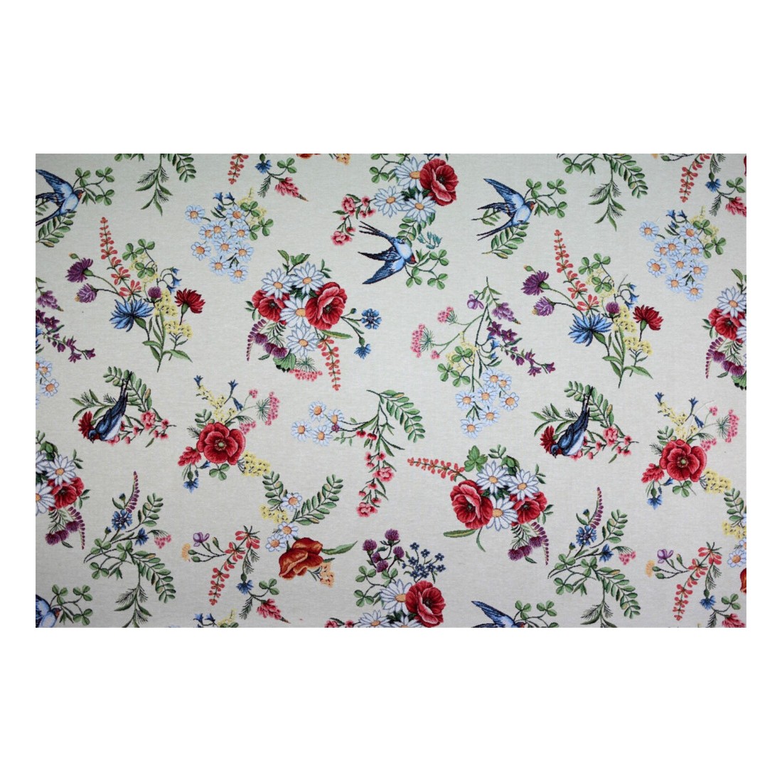 Jacquard fabric with wildflowers and swallows on a white background. Chamomille. Composition: 60% Polyester, 40% Cotton. Purchase unit: meters of fabric 140 cm wide. Weight: 397 g/m2.
