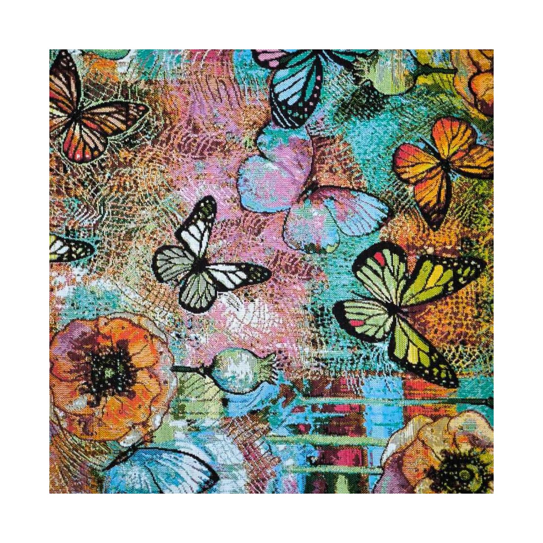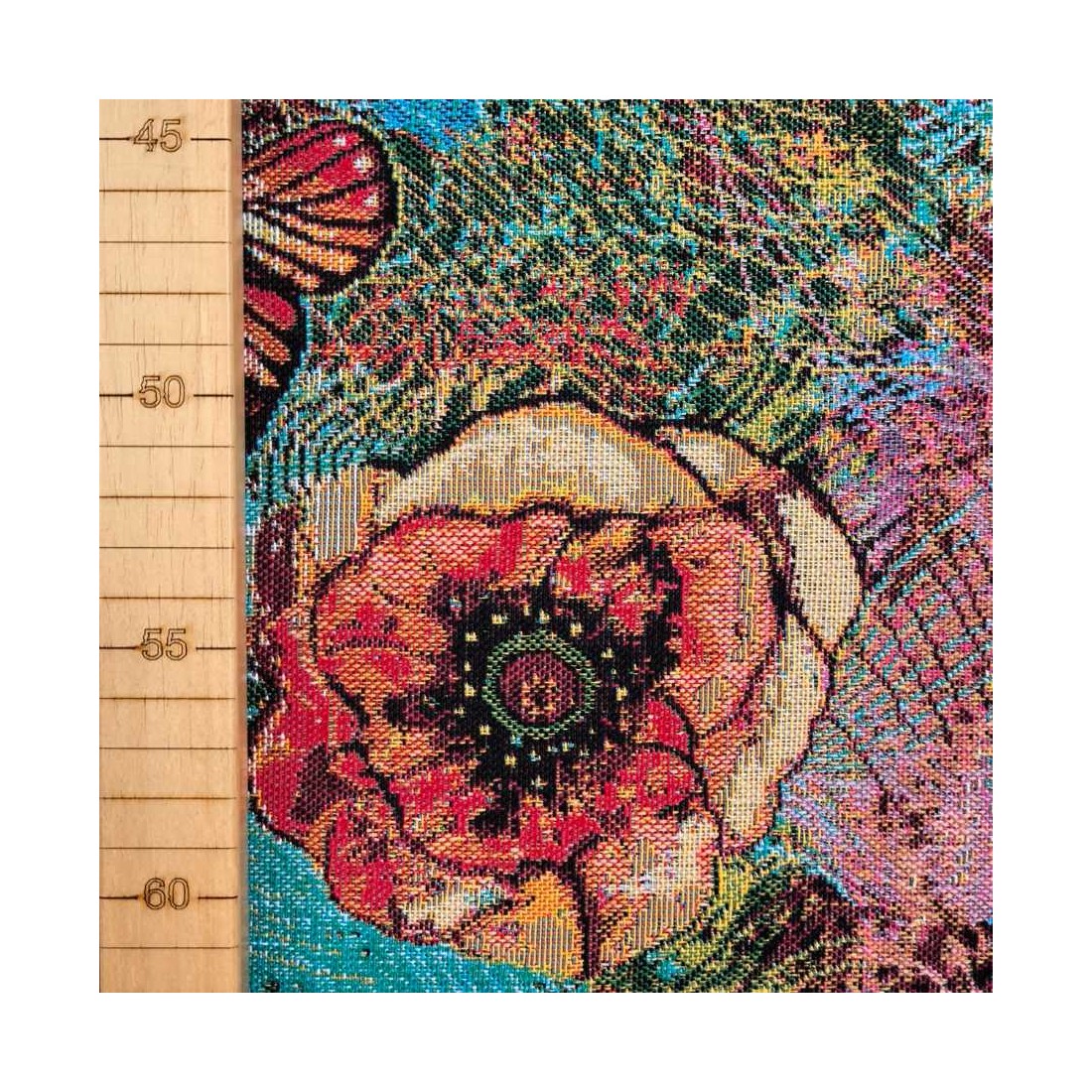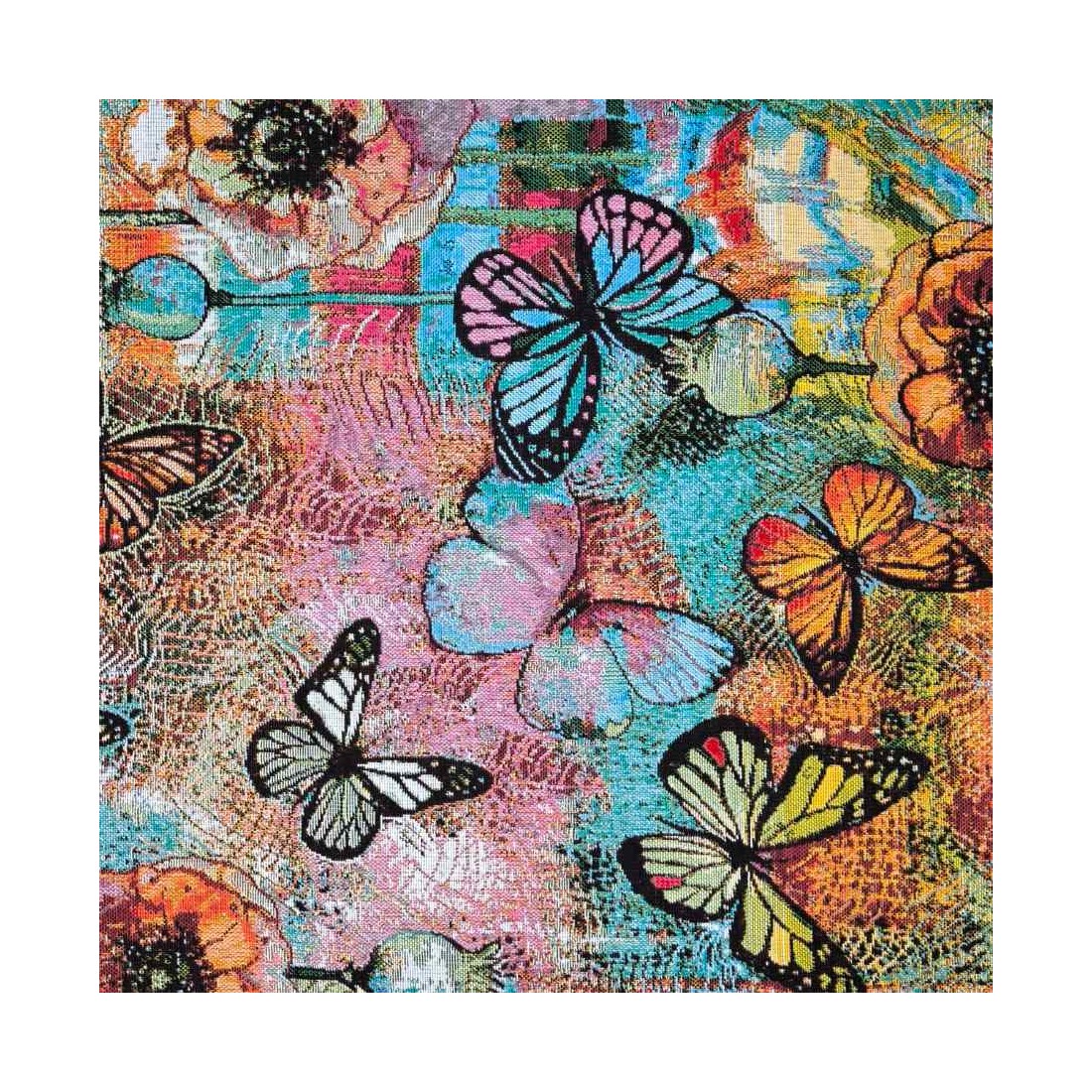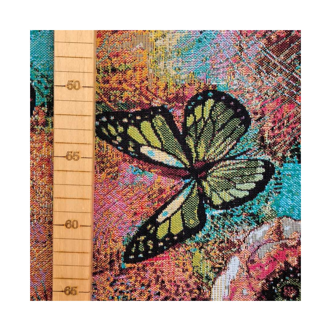 Jacquard fabric with butterflies and flowers in different colors such as yellow, orange, and a blue background. AQUAMARINA. Composition: 60% Polyester, 40% Cotton. Purchase unit: meters of fabric 140 cm wide. Weight: 397 g/m2.