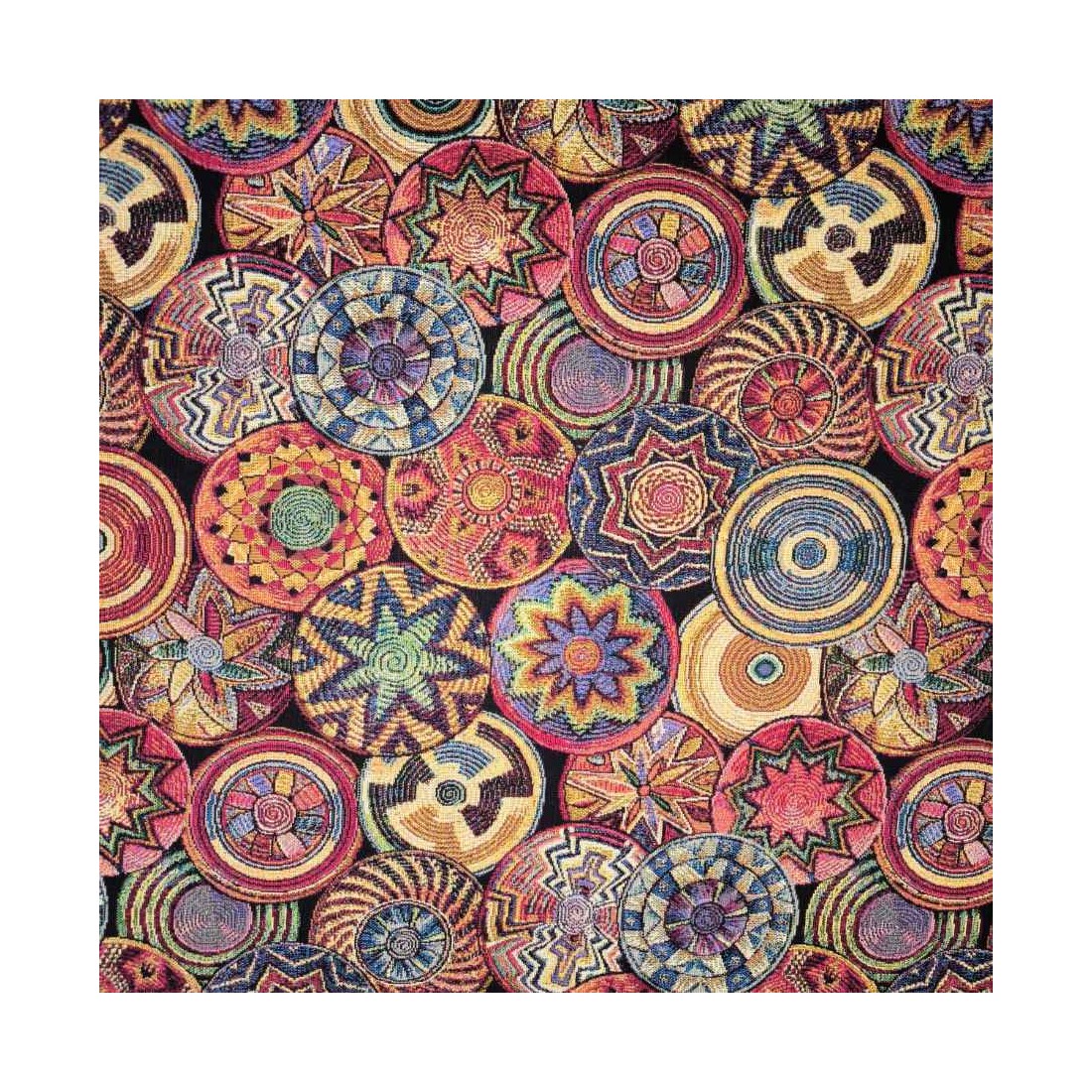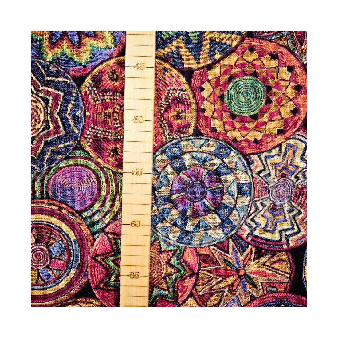 Jacquard fabric with mandalas in different colors such as yellow, purple, red, and green. Black background. SUMATRA. Composition: 60% Polyester, 40% Cotton. Purchase unit: meters of fabric 140 cm wide. Weight: 397 g/m2.