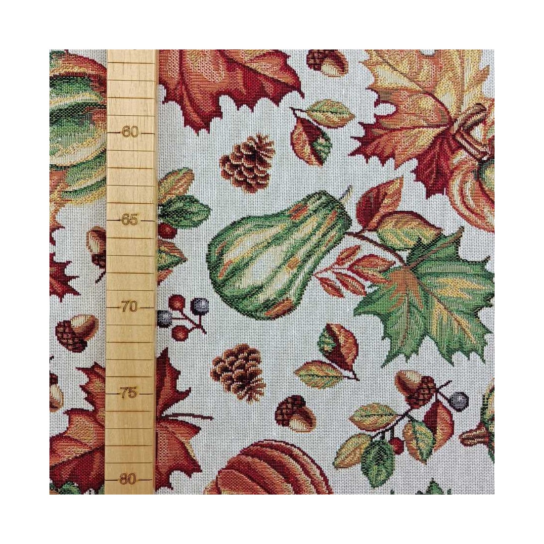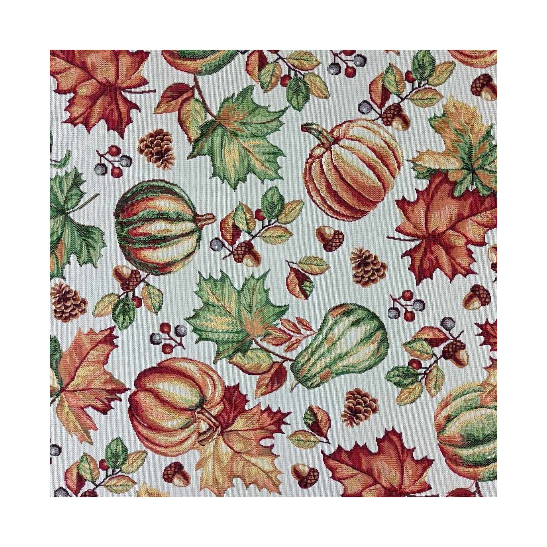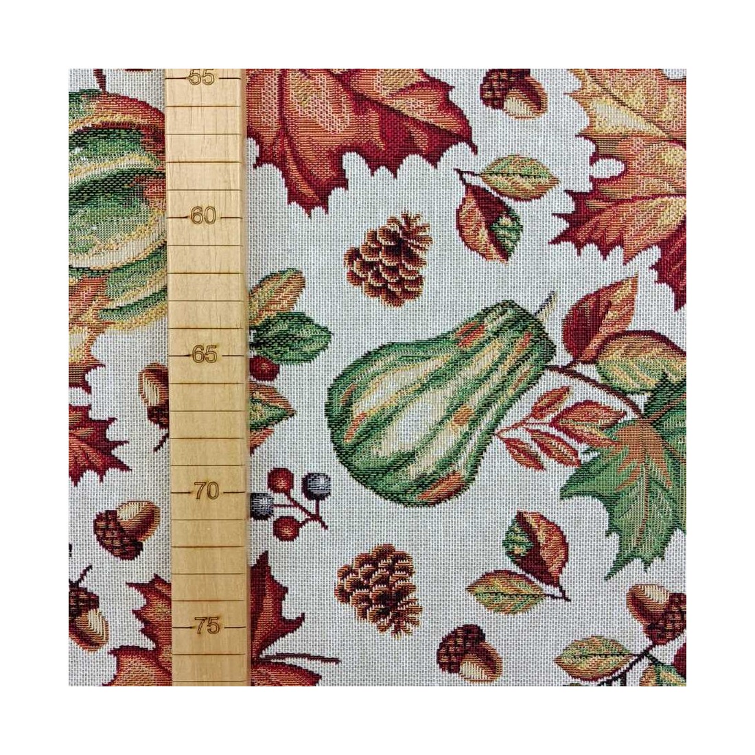 Jacquard fabric by the meter with leaves, pumpkins, pinecones, and autumn motifs in orange and green. White background. AUTUM. Composition: 60% Polyester, 40% Cotton. Purchase unit: meters of fabric 140 cm wide. Weight: 397 g/m2.