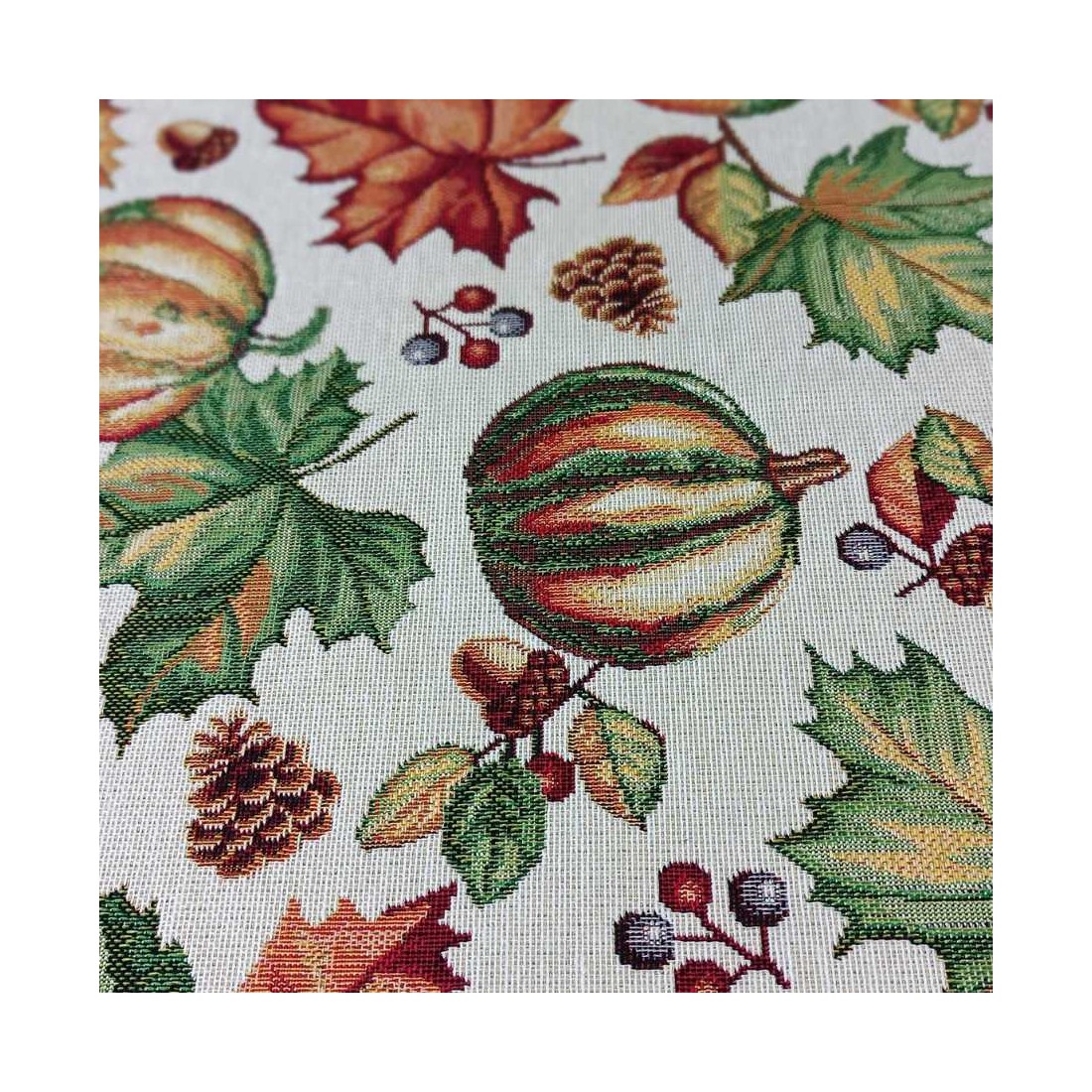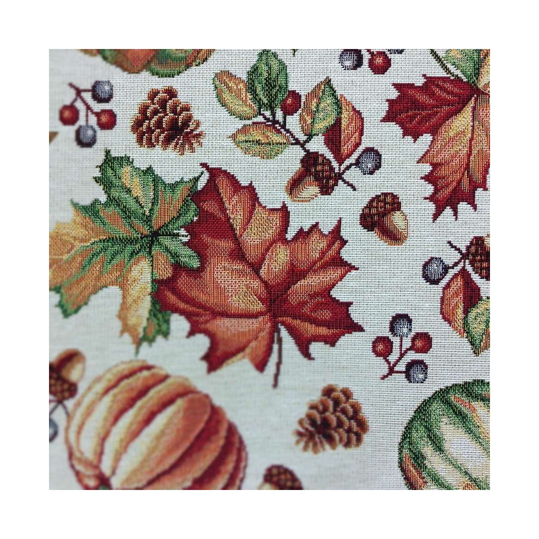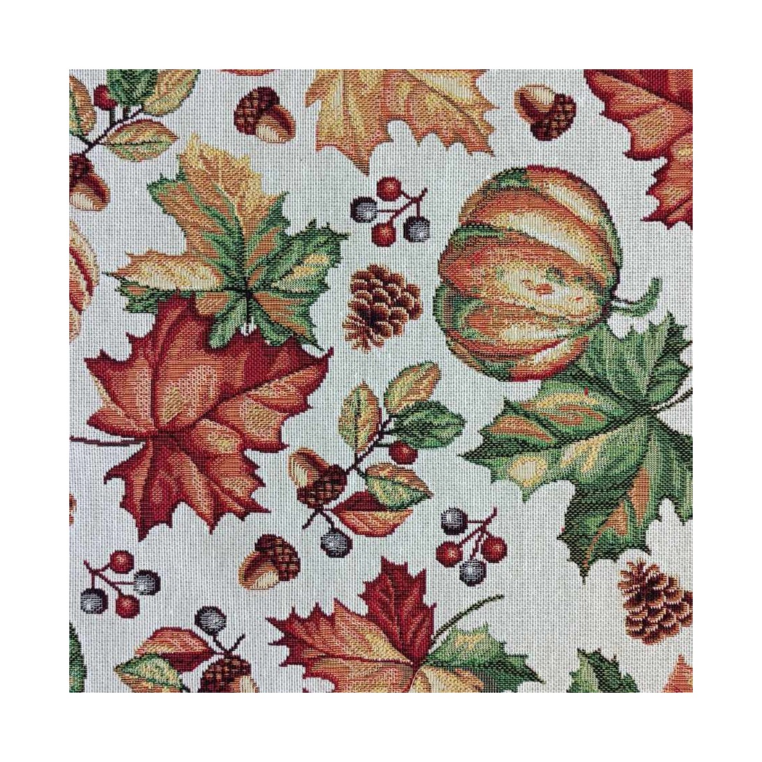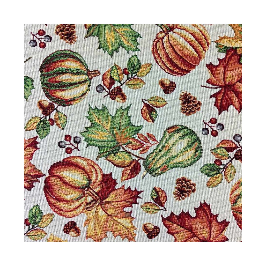 Jacquard fabric by the meter with leaves, pumpkins, pinecones, and autumn motifs in orange and green. White background. AUTUM. Composition: 60% Polyester, 40% Cotton. Purchase unit: meters of fabric 140 cm wide. Weight: 397 g/m2.