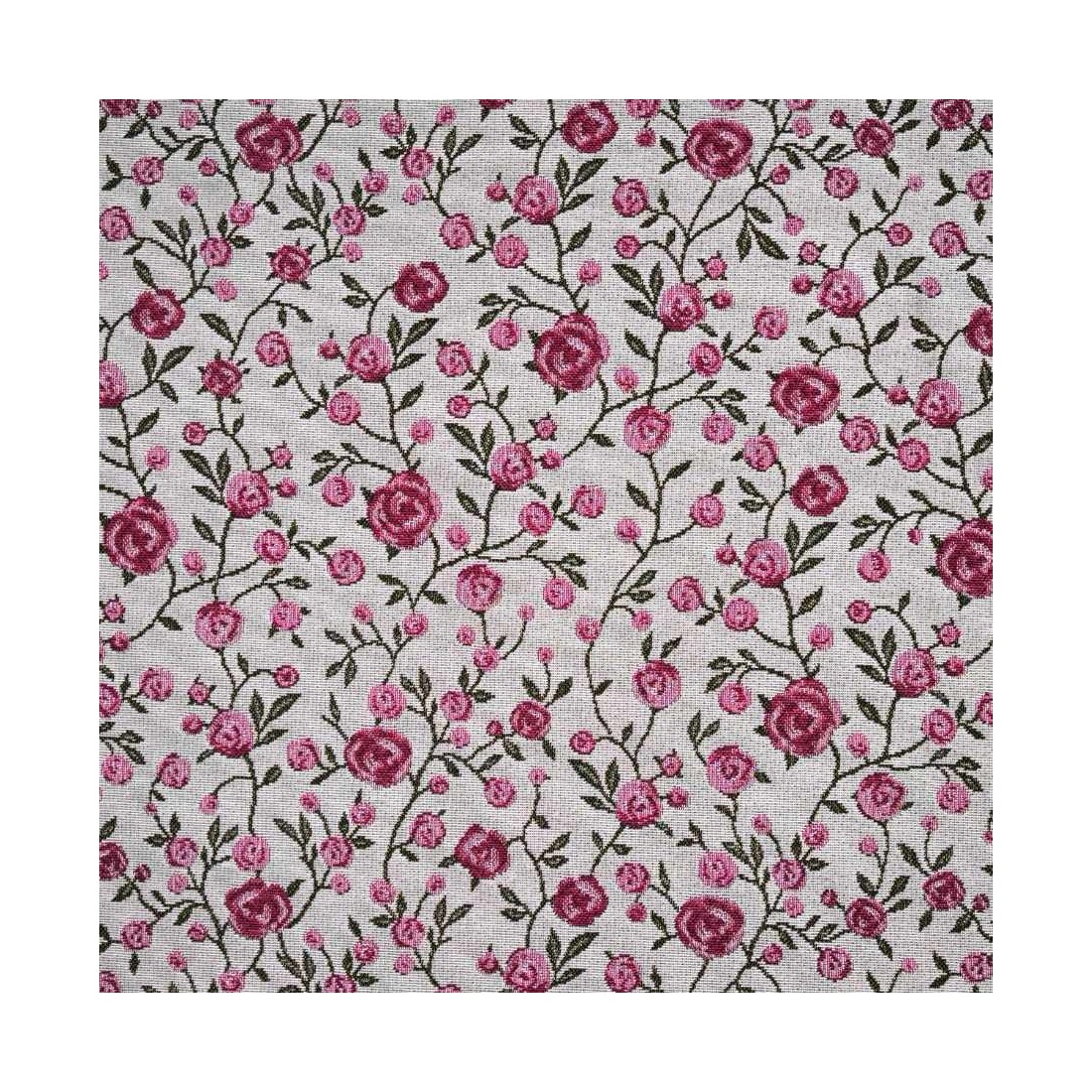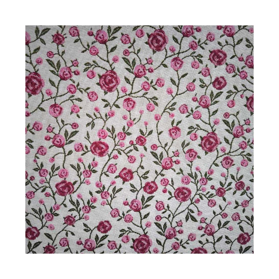 Jacquard fabric by the meter with pink flowers and green leaves. White background. WINS. Composition: 60% Polyester, 40% Cotton. Purchase unit: meters of fabric 140 cm wide. Weight: 397 g/m2.