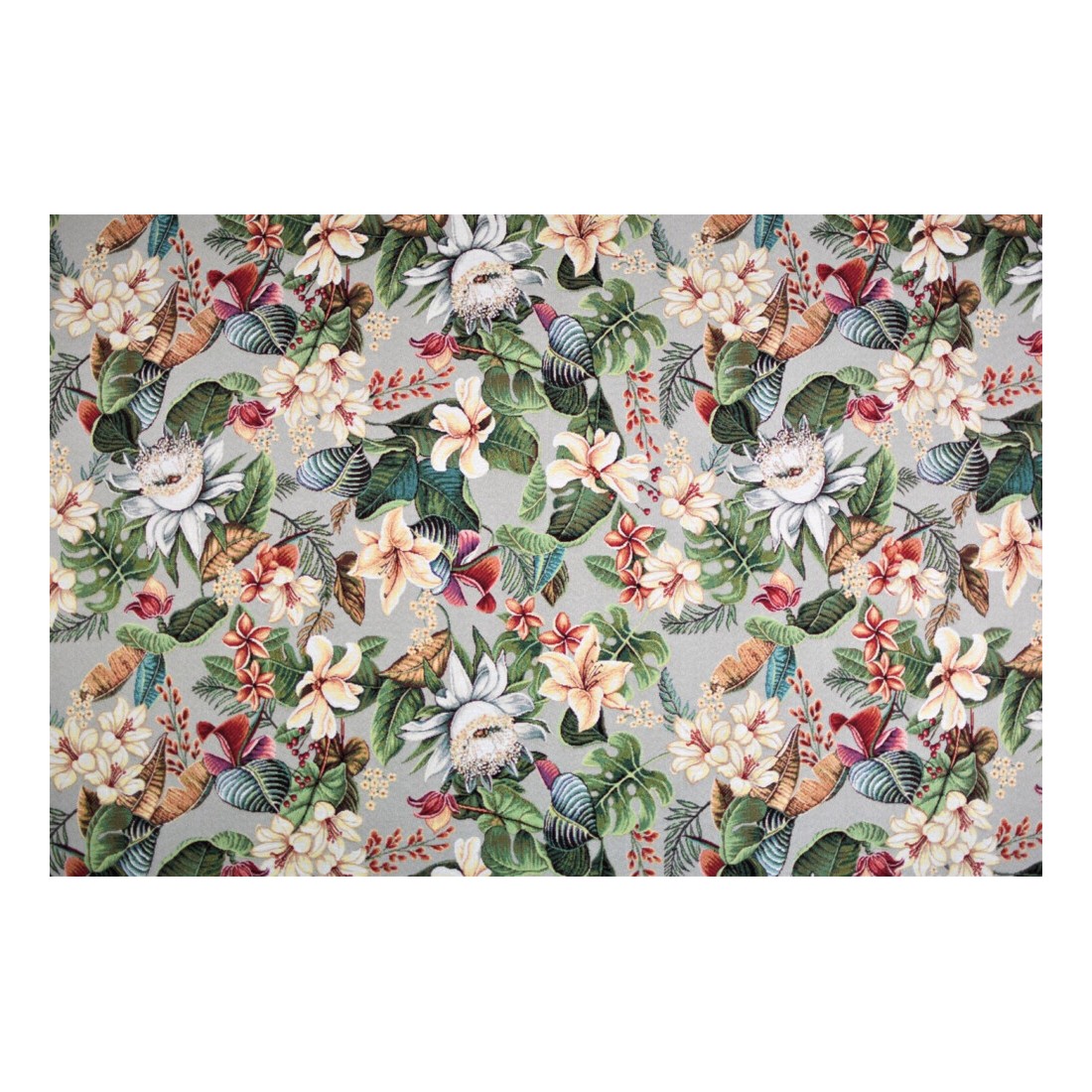 Jacquard fabric with lotus-type flowers in blue, red, and green tones on a grey background. LOTUS. Composition: 60% Polyester, 40% Cotton. Purchase unit: meters of fabric 140 cm wide. Weight: 397 g/m2.