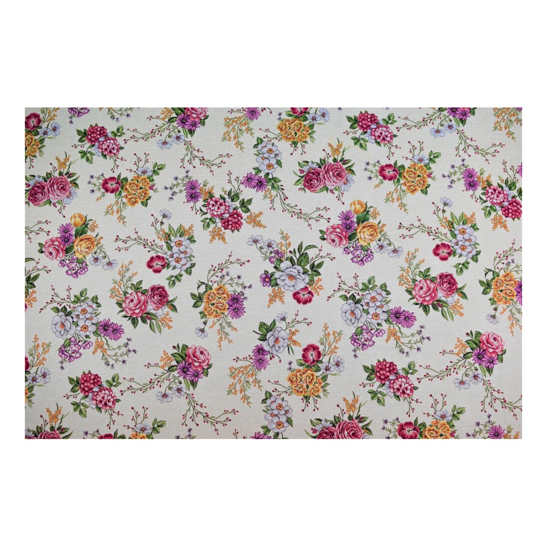 Jacquard fabric with pink and yellow flowers and beige background. XANA. Composition: 60% Polyester, 40% Cotton. Purchase unit: meters of fabric 140 cm wide. Weight: 397 g/m2.