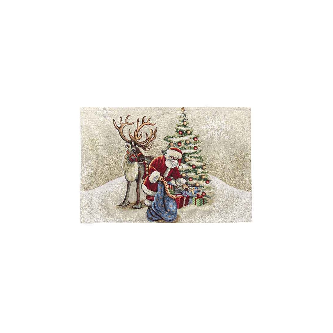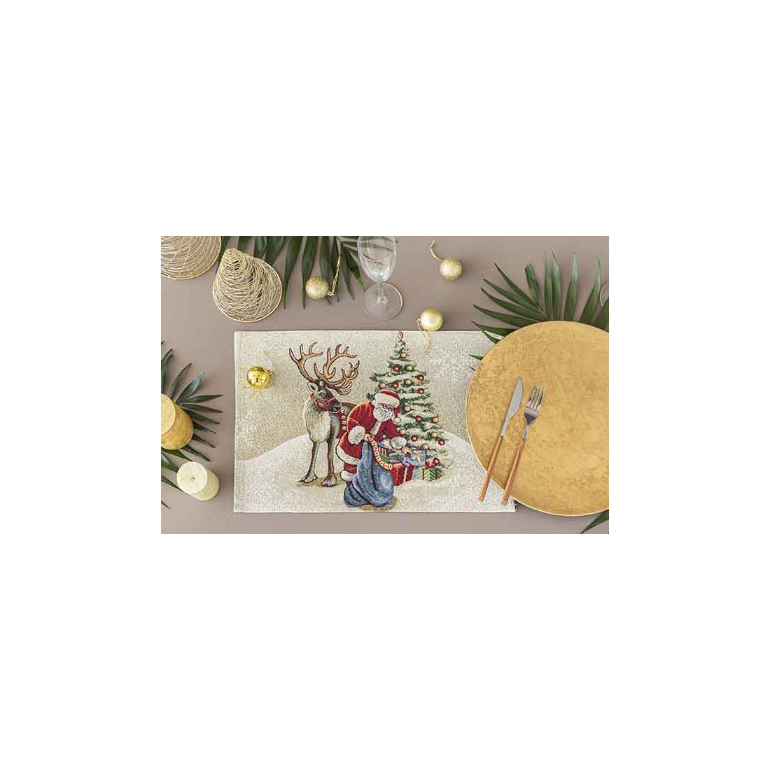 Jacquard placemat set with a central motif of Santa Claus with his reindeer and the Christmas tree. Washable.