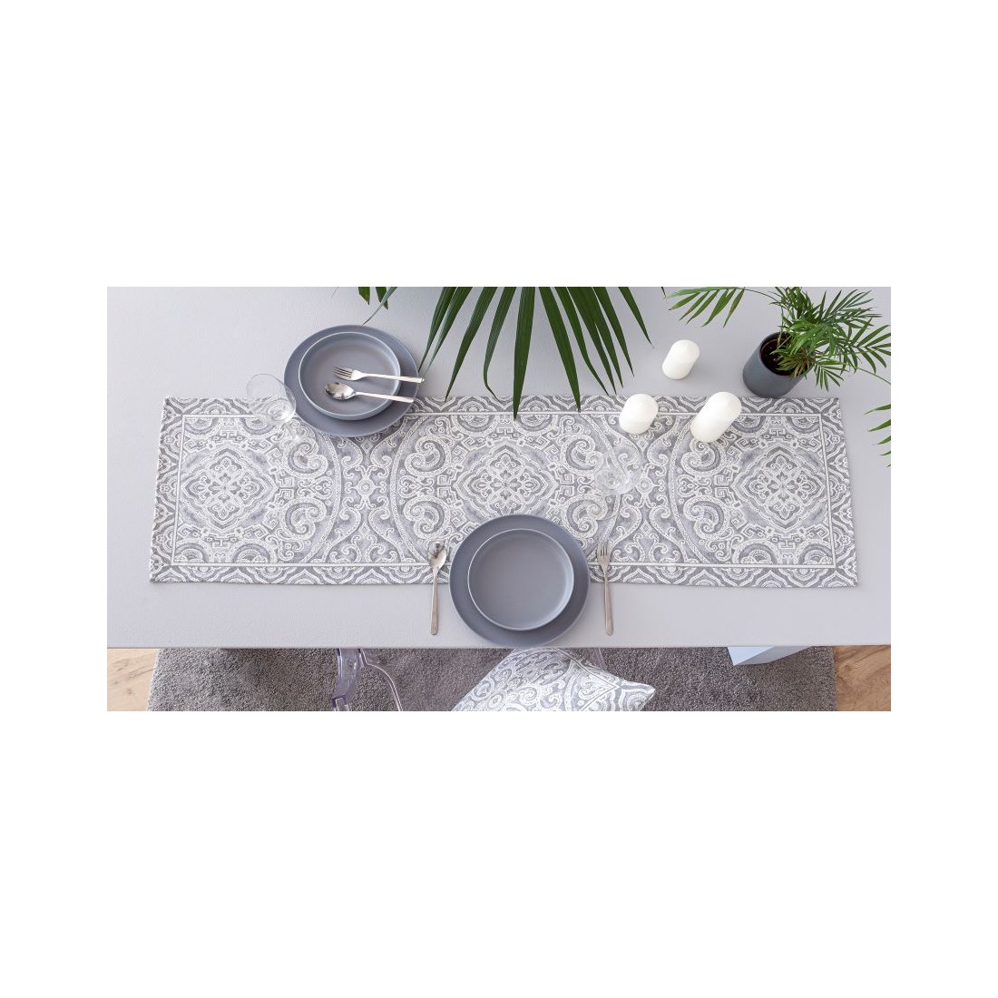 Jacquard table runner with geometric motifs in grey tones. MYKONOS C.6.