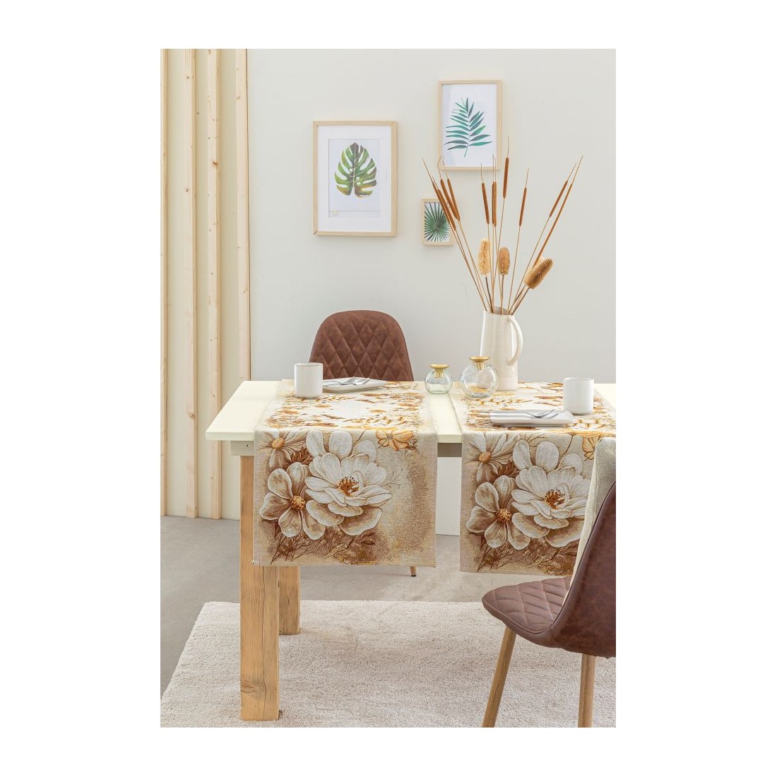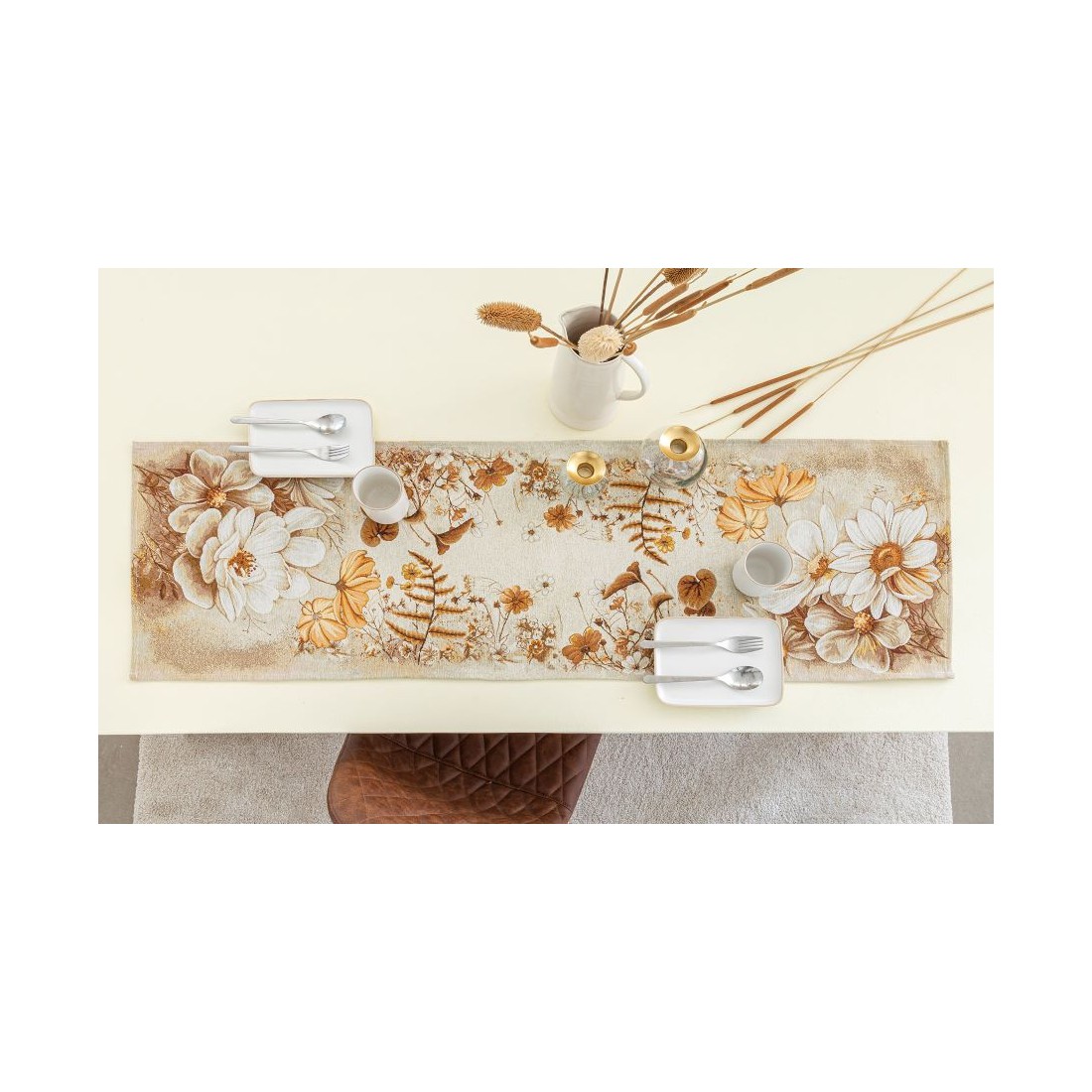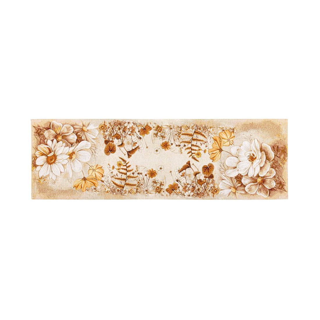 Jacquard table runner with white and golden flowers on a beige background. NITRA.