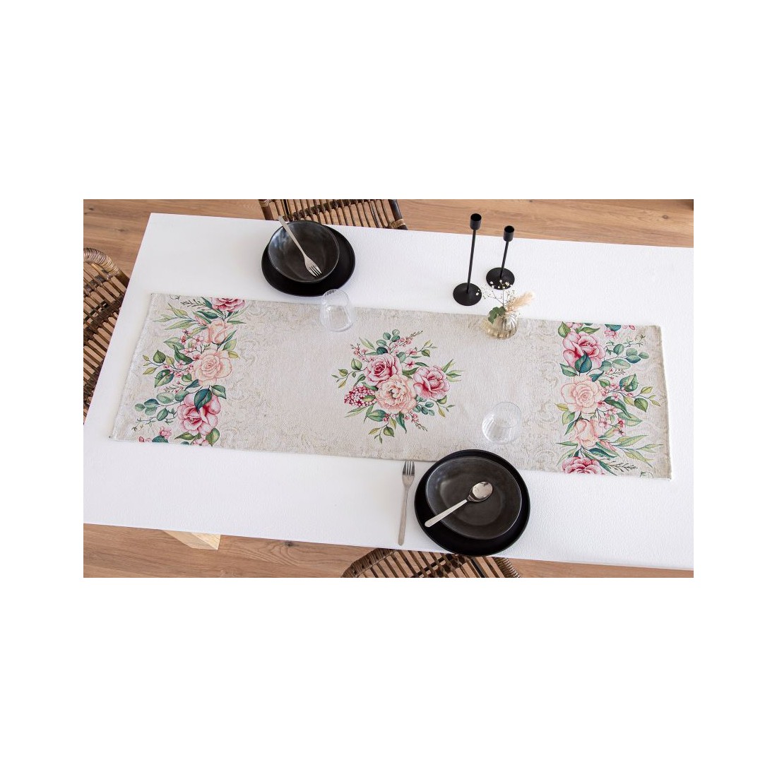 Jacquard table runner with roses in pastel pink tones, green leaves, and a beige background. Washable. PADUA.