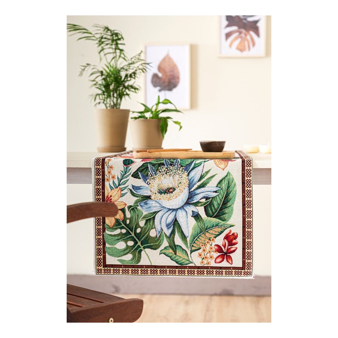Jacquard table runner with lotus-type flowers in blue, red, and green tones on a beige background. Washable. LOTUS.