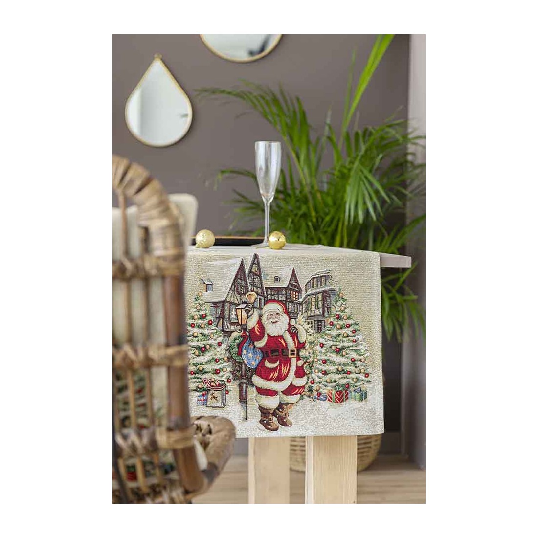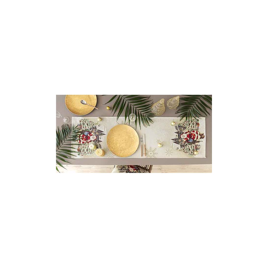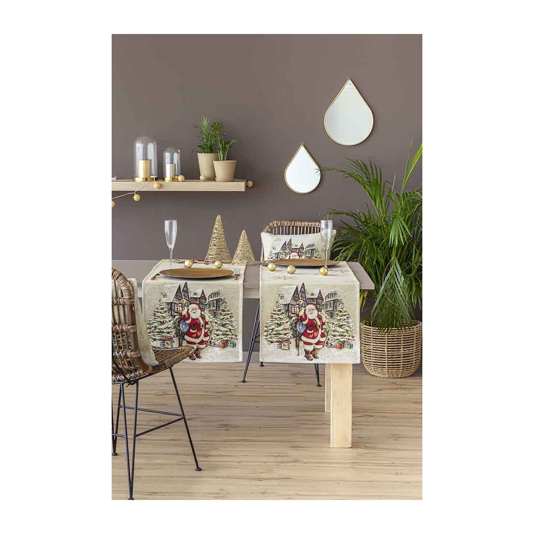 Jacquard table runner with pink and yellow flowers on a beige background. Washable. XANA.
