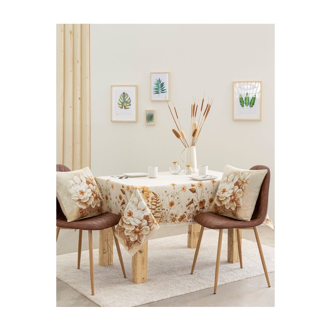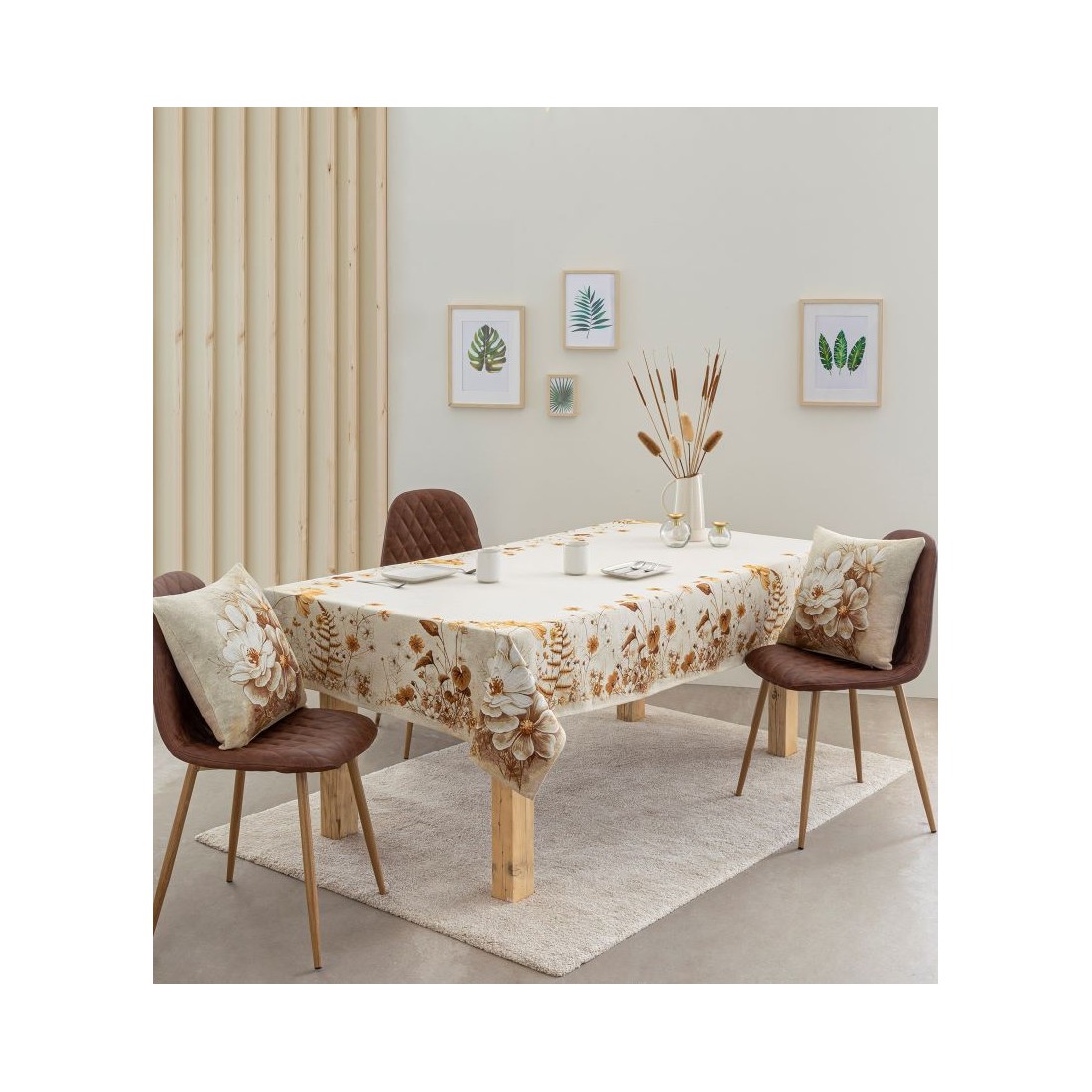 Jacquard tablecloth with white flowers with golden details, giving a delicate touch to the home interior. Washable.