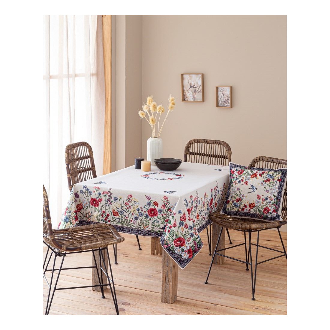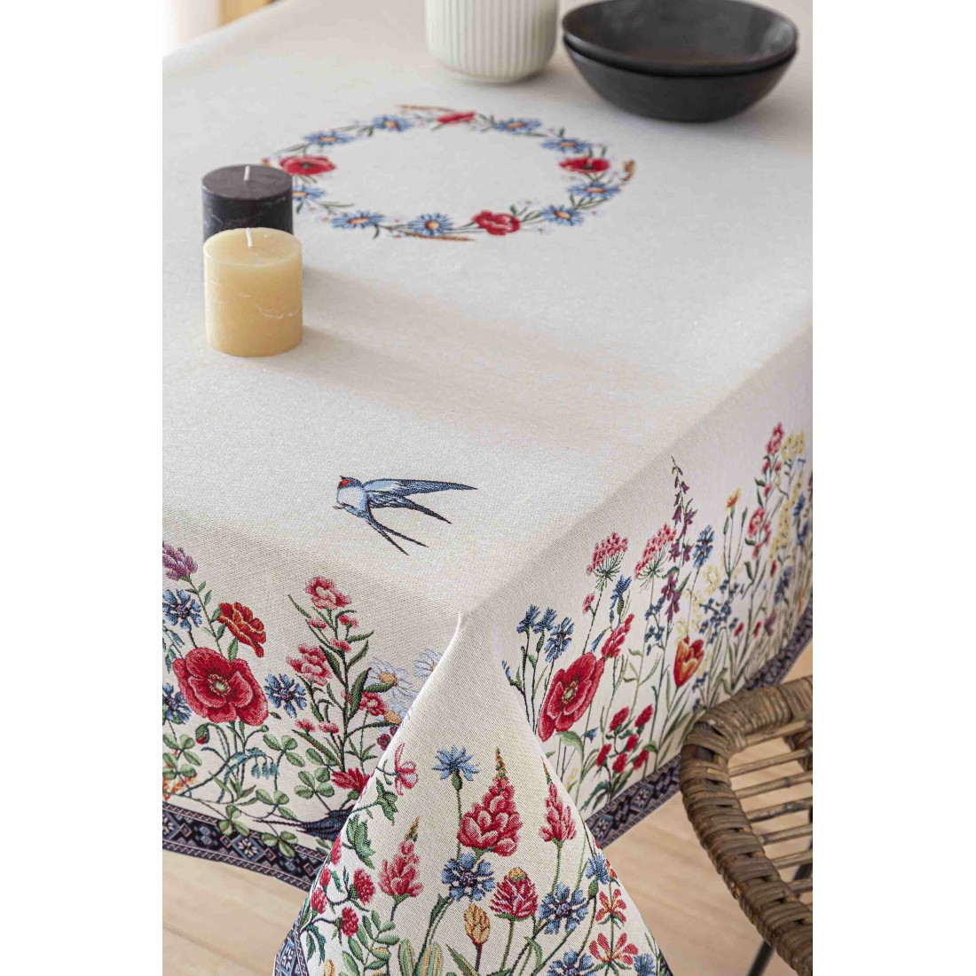 Jacquard tablecloth with wildflowers and swallows. White background.