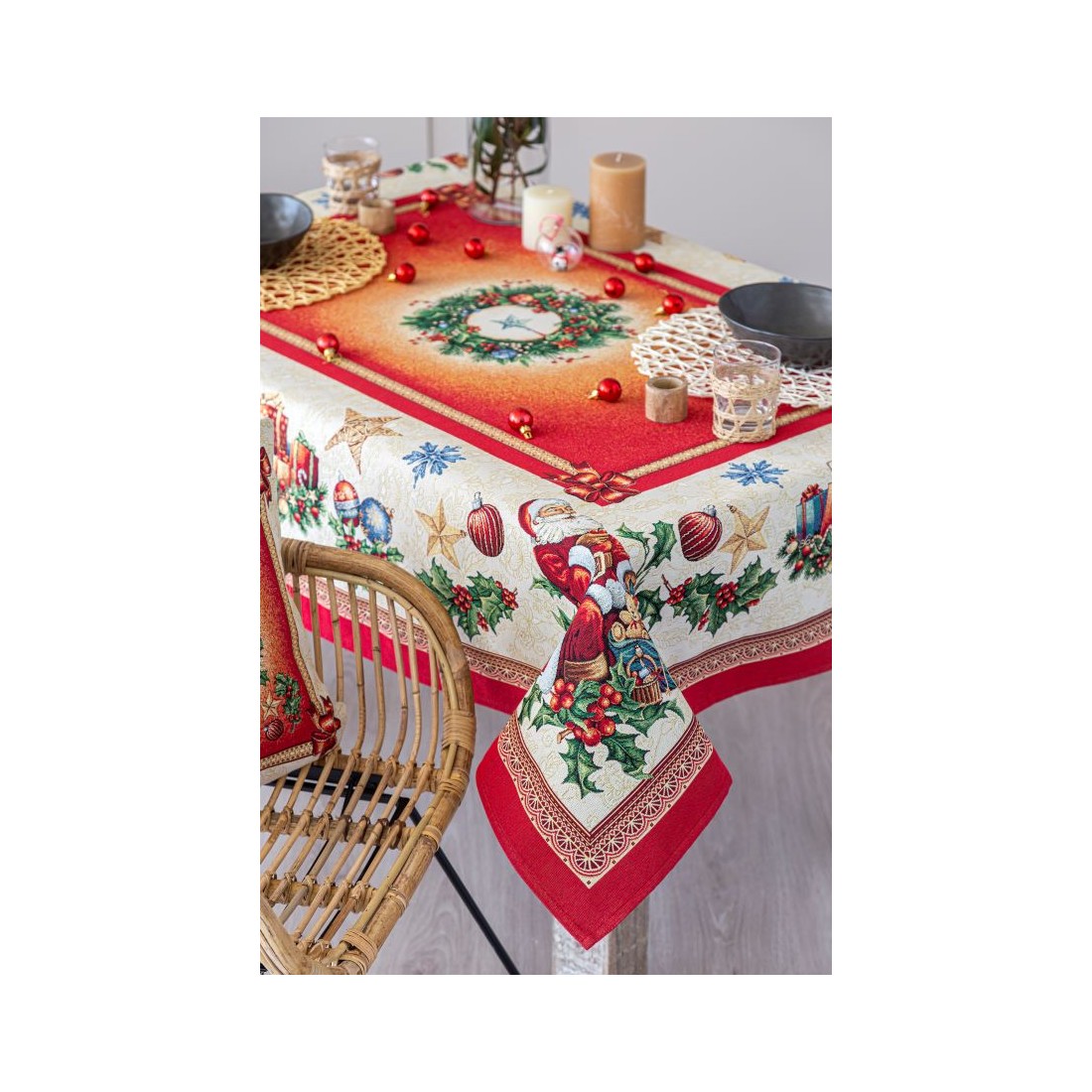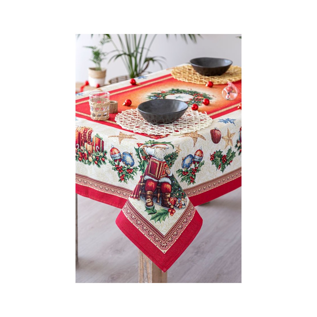 Jacquard tablecloth with Christmas motifs (gifts and baubles) in the center and a Santa Claus in each corner. The background is beige with a red border. Composition: 60% Polyester, 40% Cotton. CHRISTMAS