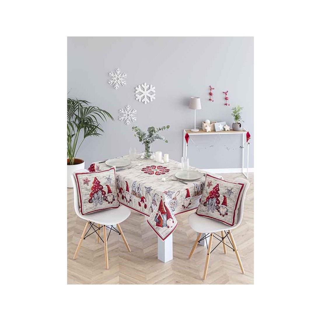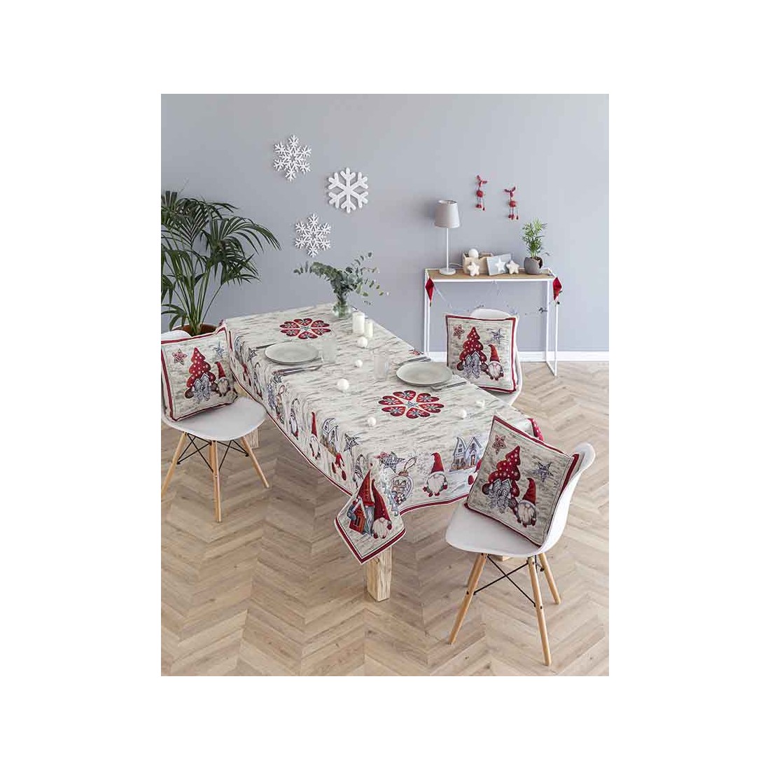Jacquard tablecloth with Christmas gnome motifs in grey and red tones.