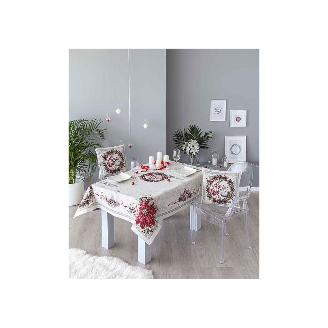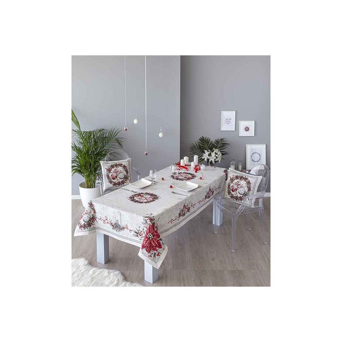 Jacquard tablecloth with poinsettia and Christmas wreath. It stands out for its grey and red tones with a shiny touch provided by the lurex. Washable.