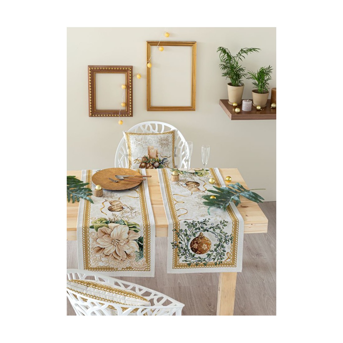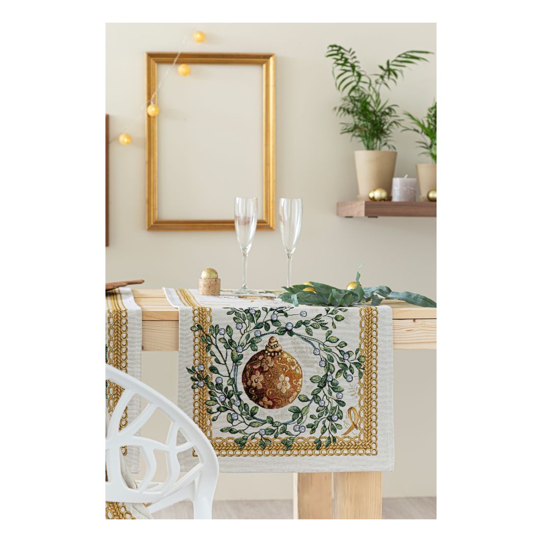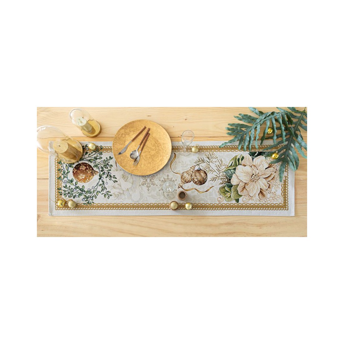Camino de mesa de tejido jacquard con motivos navideños (bolas, piñas y flor). Con tonos dorados y marrones. Es un camino de mesa muy elegante gracias al toque de brillo que le proporciona el lurex. Lavable. CANDLE