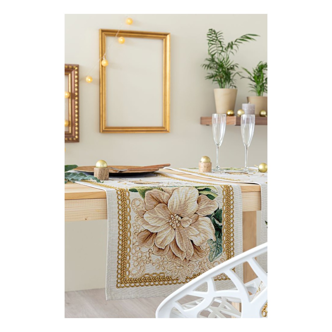 Camino de mesa de tejido Jacquard con flores y fondo beig. 40x135 Xana.