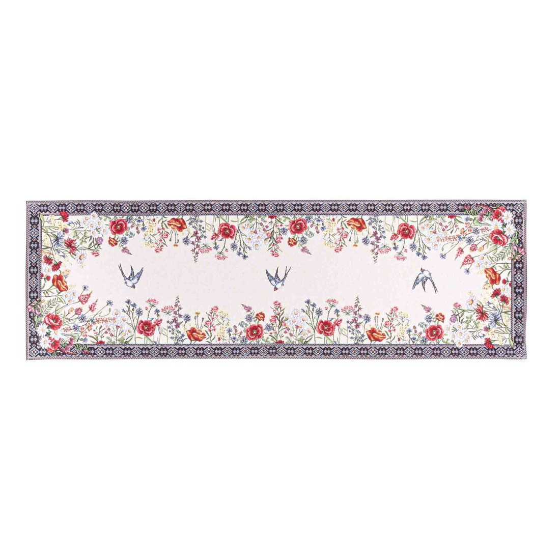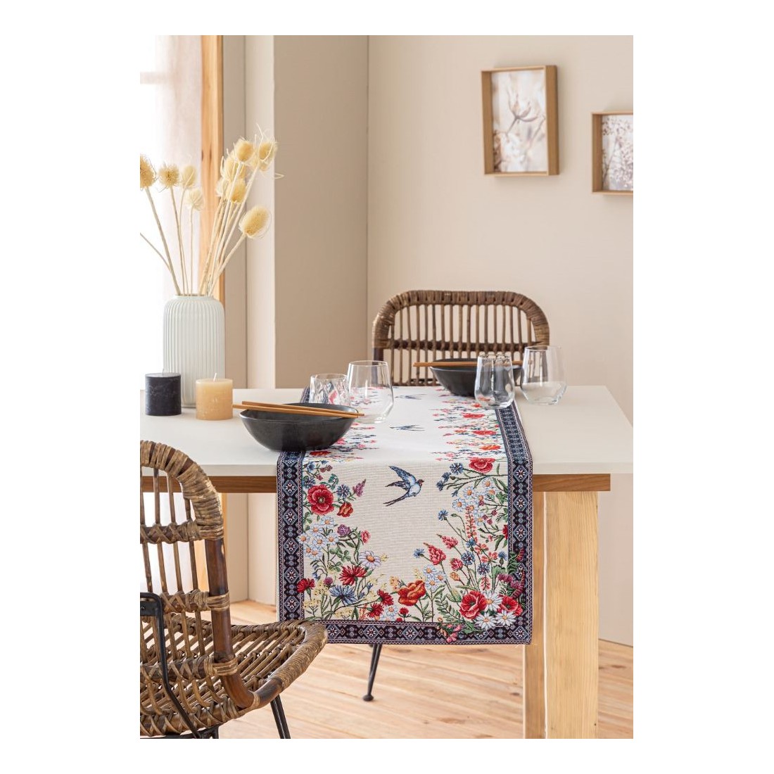 Camino de mesa de tejido jacquard con flores silvestres y golondrinas. Fondo blanco. Lavable. CHAMOMILLE Tamaño: 40x135
