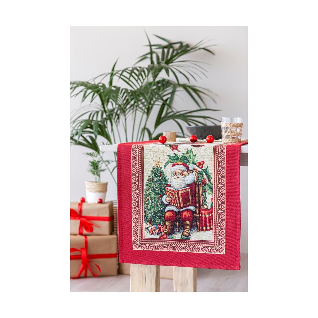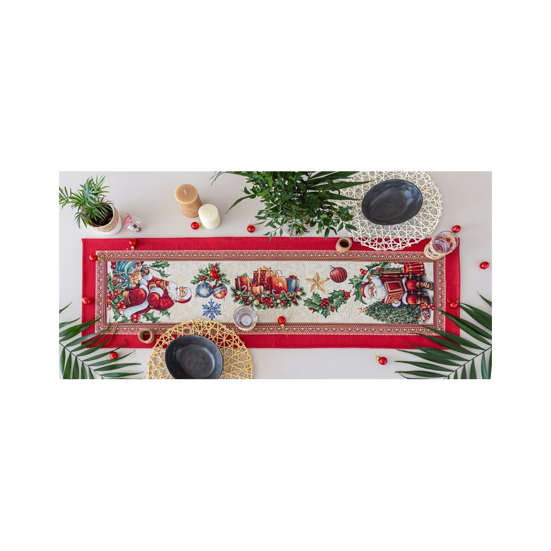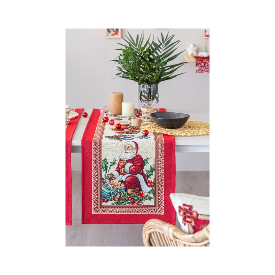 Camino de mesa de tejido jacquard con motivos navideños (regalos y bolas) en el centro y en cada esquina un Papa Noel. Su fondo es beig y con un borde rojo. Lavable. CHRISTMAS