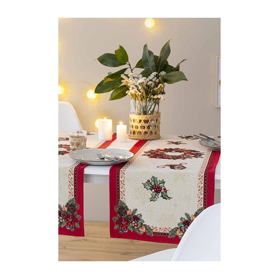 Camino de mesa de tejido jacquard con corona central y motivos navideños (piñas y campanas). Con fondo beig y borde rojo. Lavable. FIDELITY
