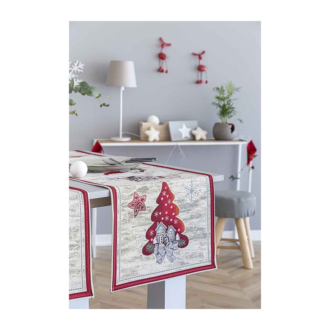 Camino de mesa de tejido jacquard con motivos Gnomos navideños en tonalidades gris y rojo. GNOMOS