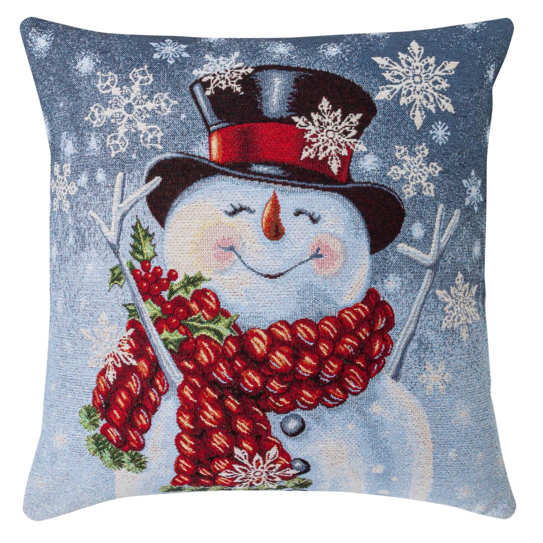Funda cojin Jacquard con Muñeco de Nieve con bufanda roja y sombrero de copa negro y lazo rojo. Destacan los tonos azulados del cielo contrastando con el color blanco del muñeco y las tonos rojos en la bufanda y el lazo del sombrero, con el brillo especial que le da el lurex. Lavable. SVEN