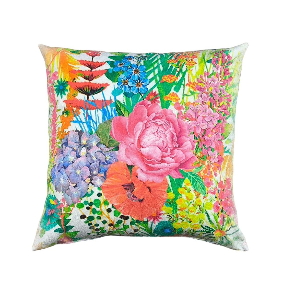 Funda de cojin con diversidad de flores como amapola, hortensia en tonalidades de rojos, rosas, azules y verdes. Cierre con cremallera. Lavable. DEMETER