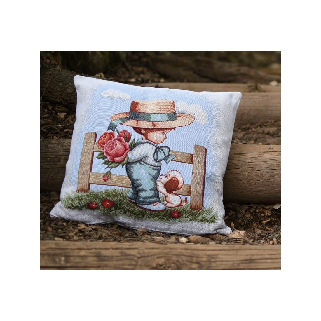 Funda cojín Jacquard Niño con ramo de flores y perro. Cierre con cremallera. Lavable. BOY