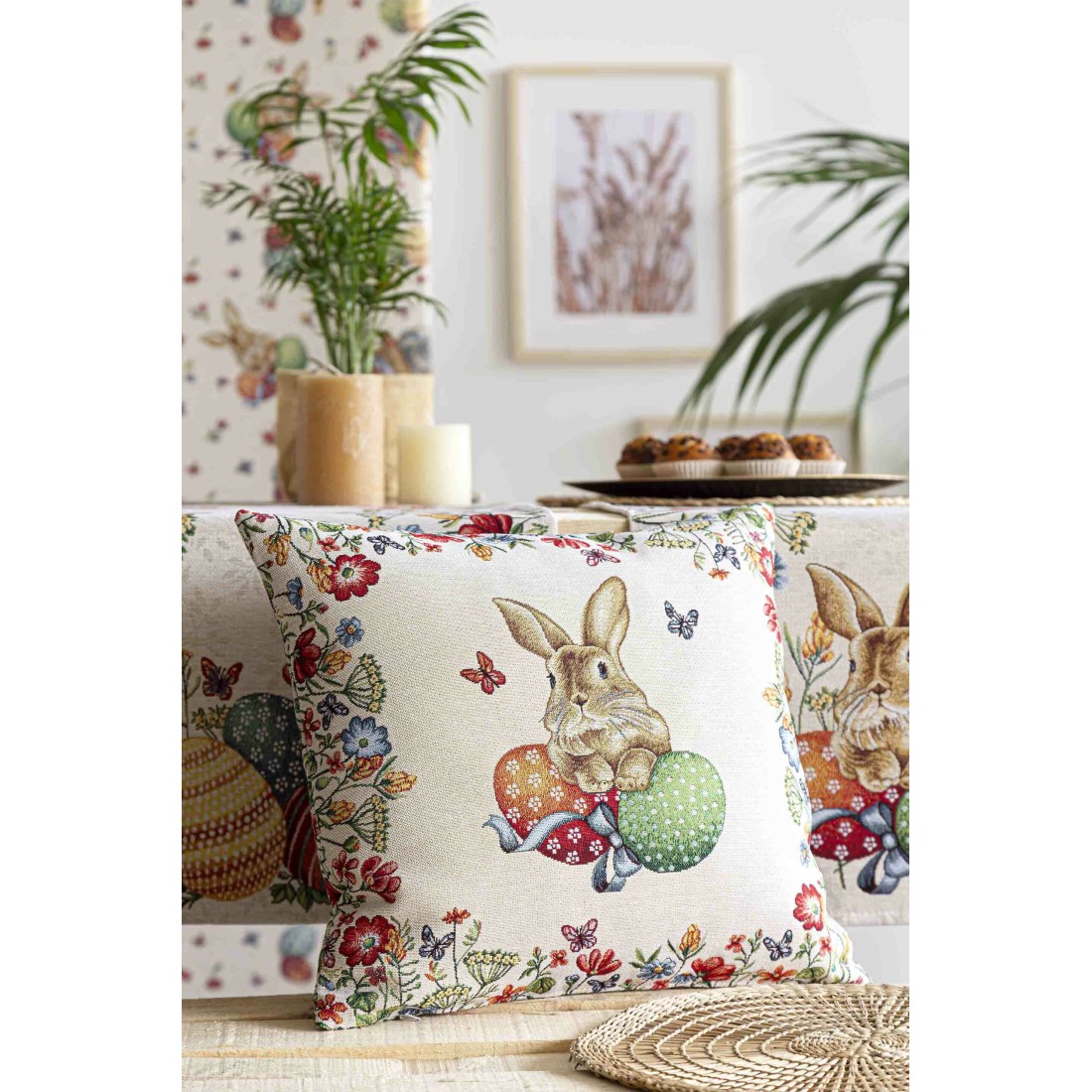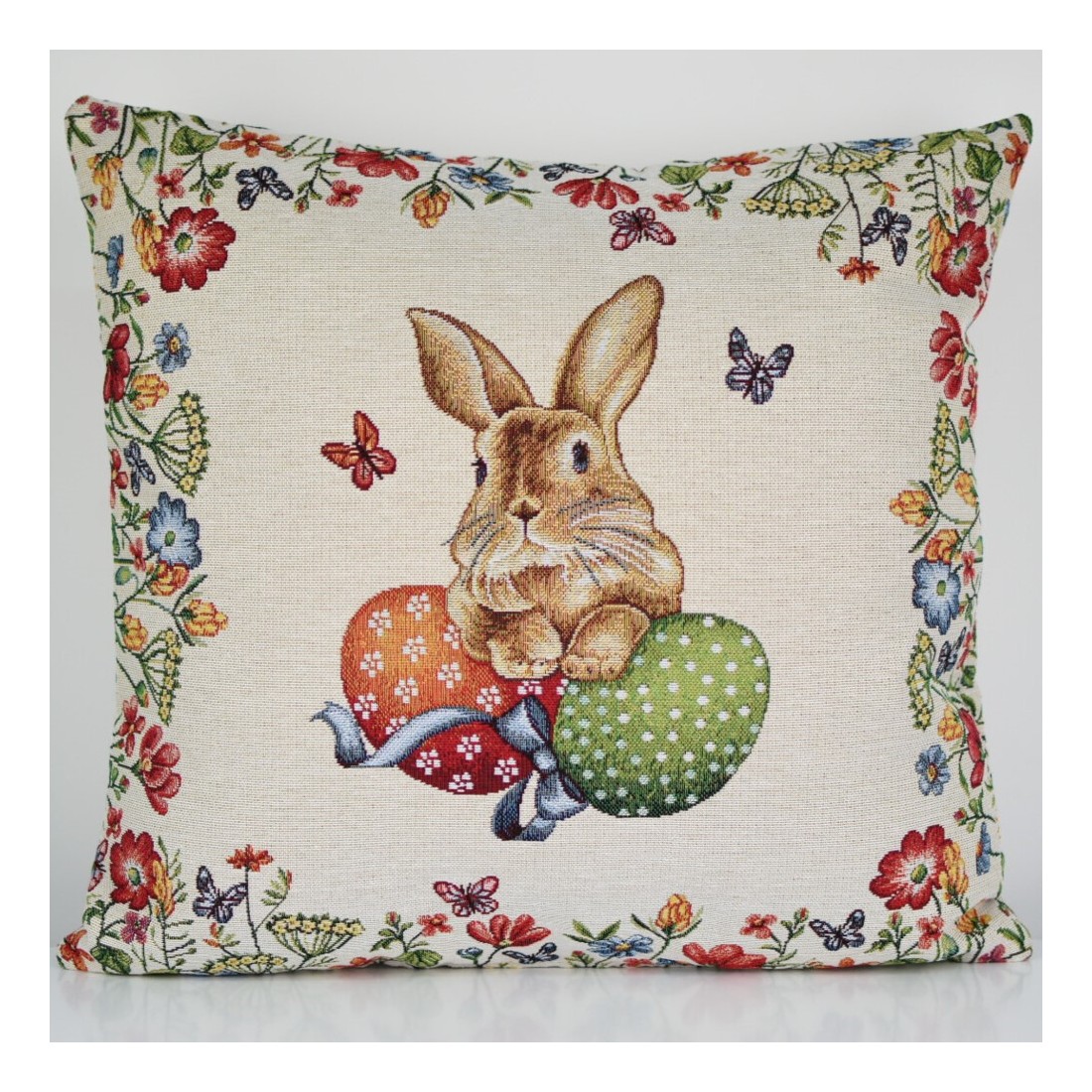 Funda cojin Jacquard con un conejo central acompañado por los tradicionales huevos de pascua. El borde del cojin está compuesto con pequeñas flores primaverales y unas pequeñas mariposas. Cierre con cremallera. EGGS