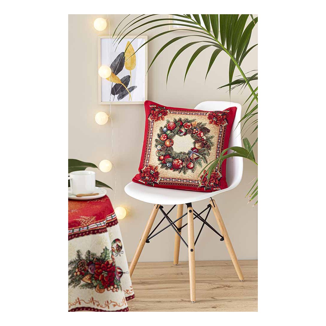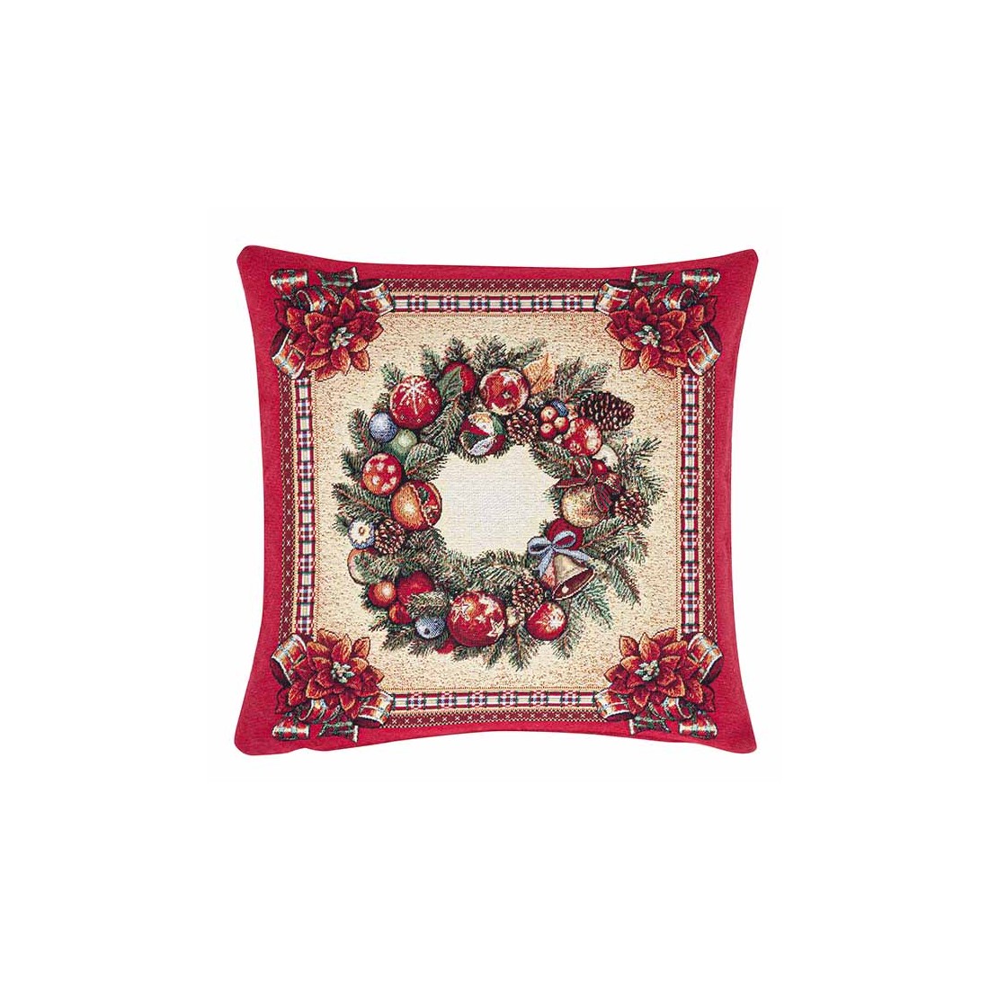 Funda cojin Jacquard con motivos navideños: corona, campanas, bolas y borde rojo. Cierre con cremallera. Lavable. FIDELITY