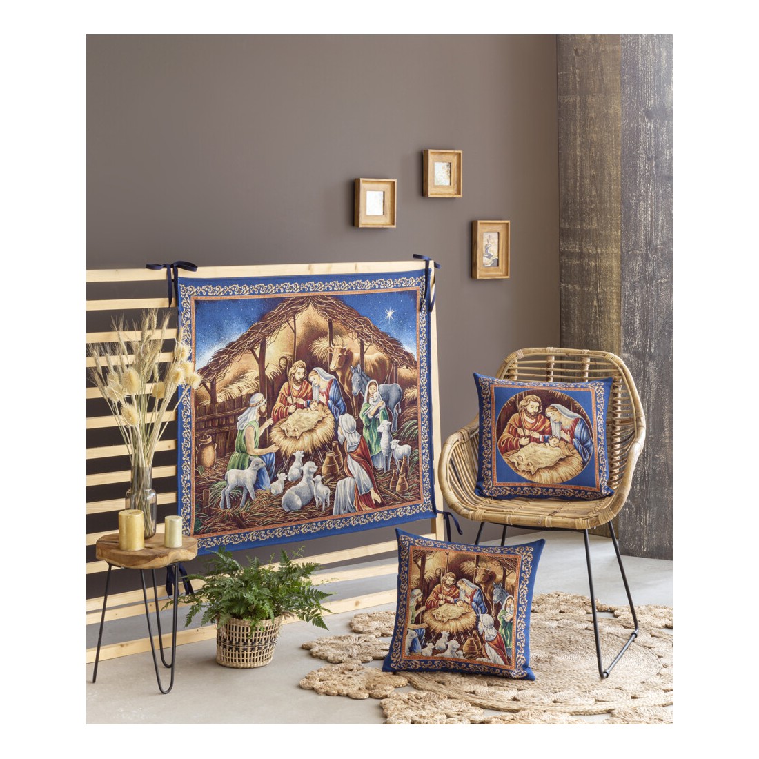 Balconera jacquard con la imagen del nacimiento de Jesús y la adoración de los pastores en fondo Azul y borde ornamental dorado. DE REGALO, un cojín por una cara la adoración y por la otra el nacimiento. Con lurex que le da un toque muy elegante. Lavable.