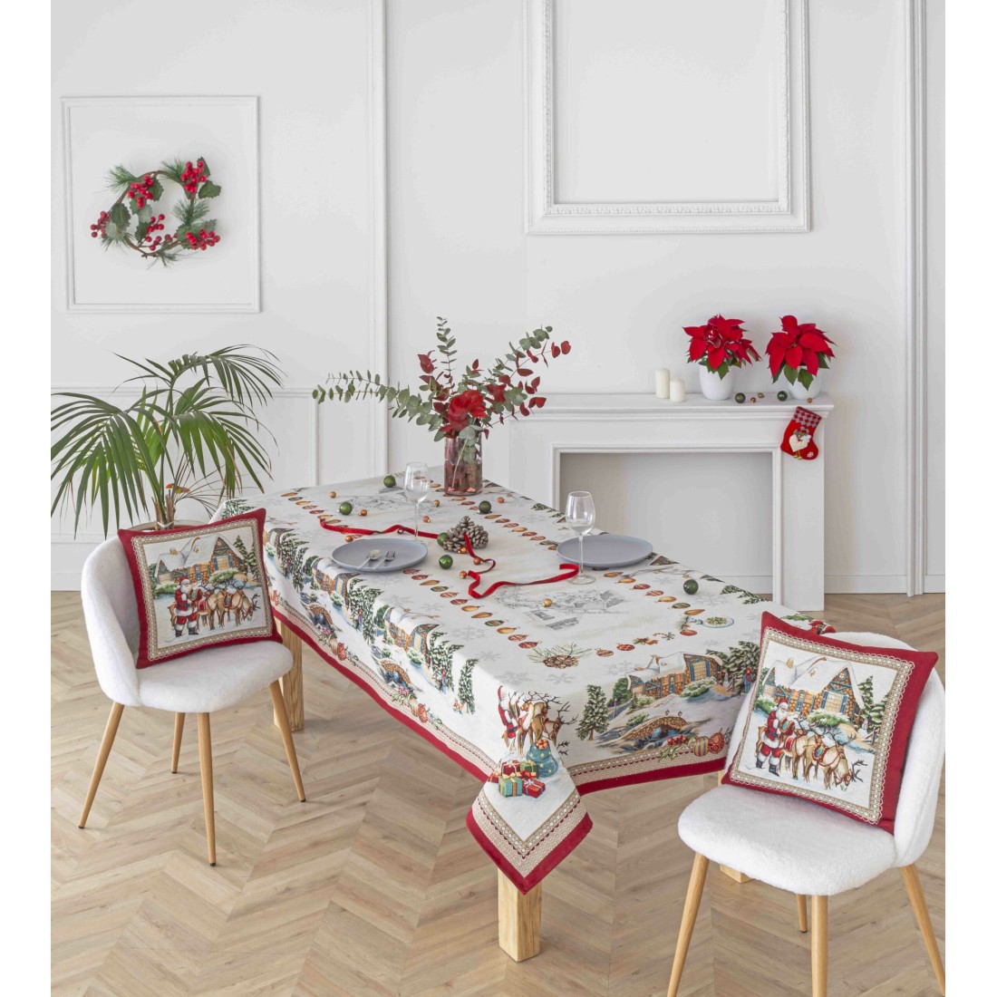 Mantel de tejido jacquard con Papa noel en la nieve junto su reno y casa nevadas. El centro esta enmarcado con unas bolas navideñas y piñas, y en medio un Papa Noel con su trineo y los renos. Lavable.