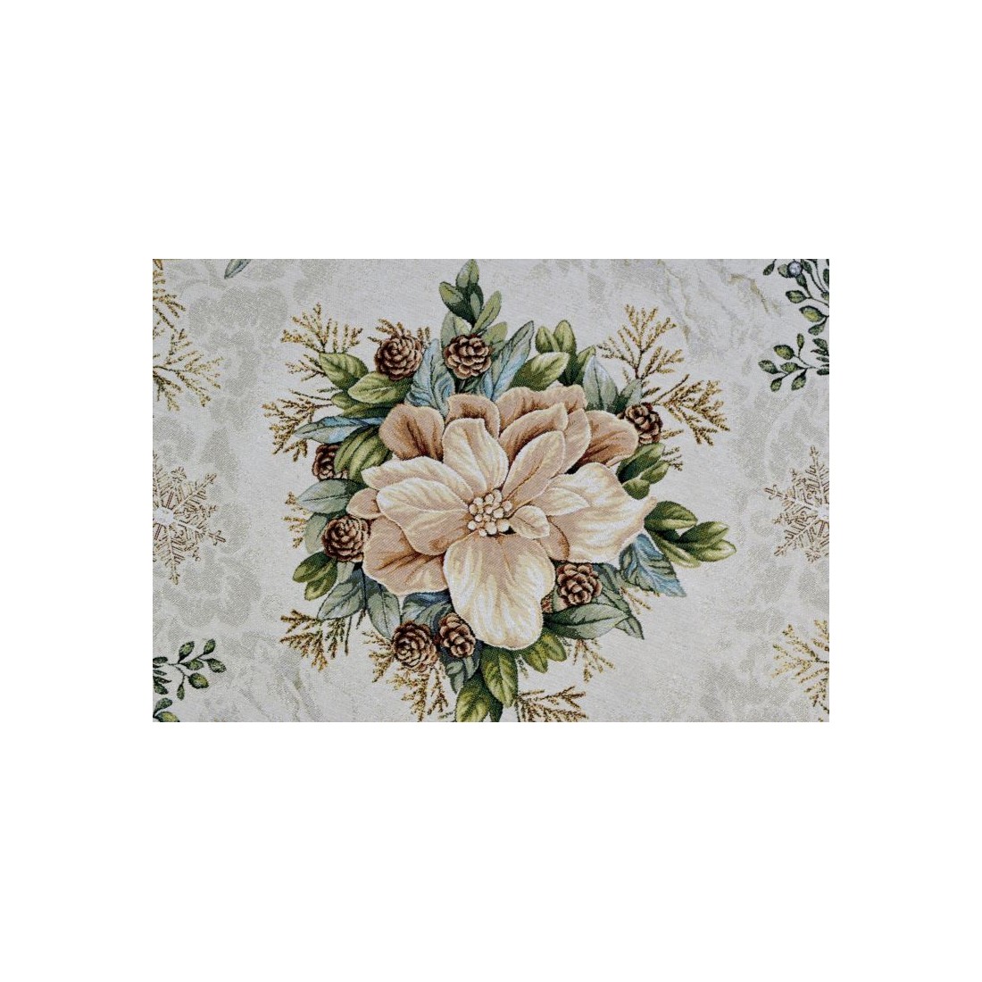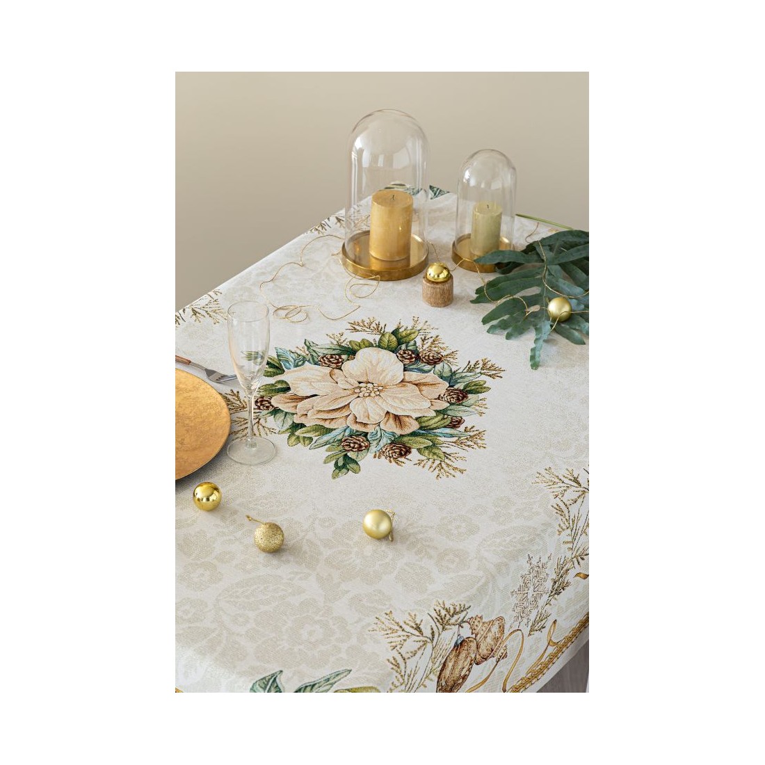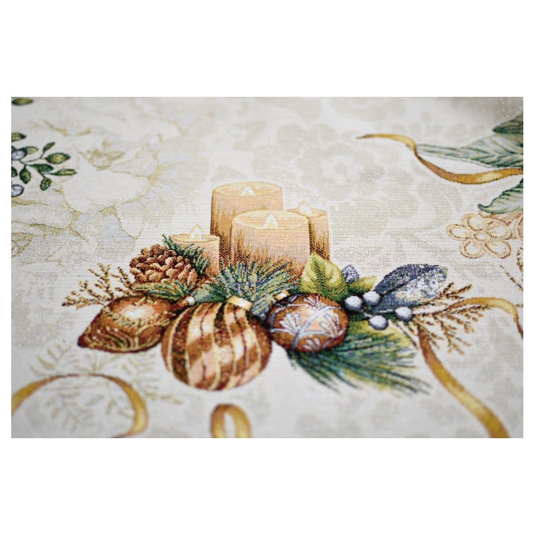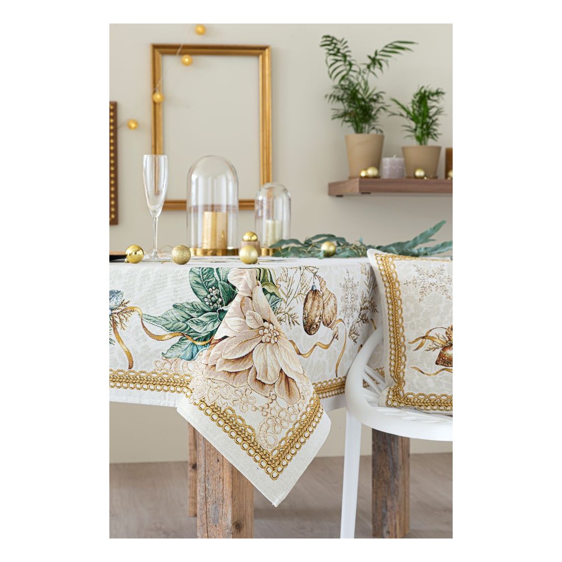 Mantel de tejido jacquard con motivos navideños (bolas, piñas, cirios y flor). Con tonos dorados y marrones. Es un mantel de mesa muy elegante gracias al toque de brillo que le proporciona el lurex. Lavable.