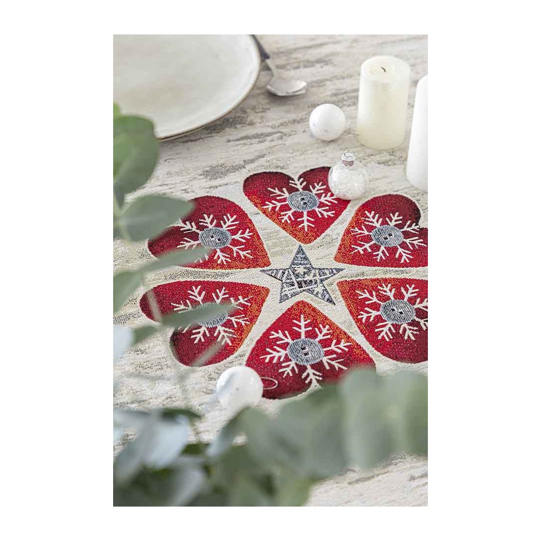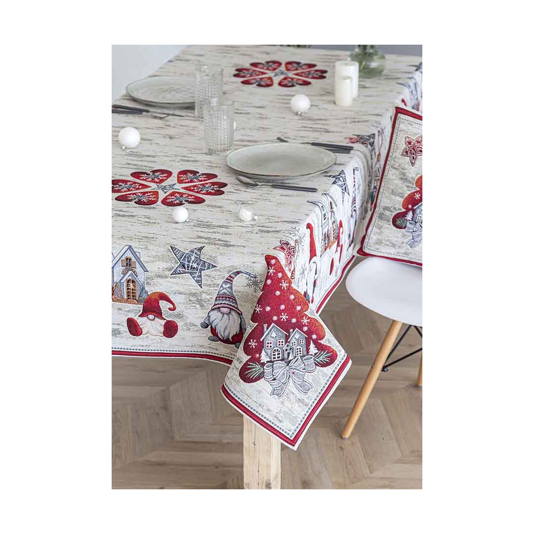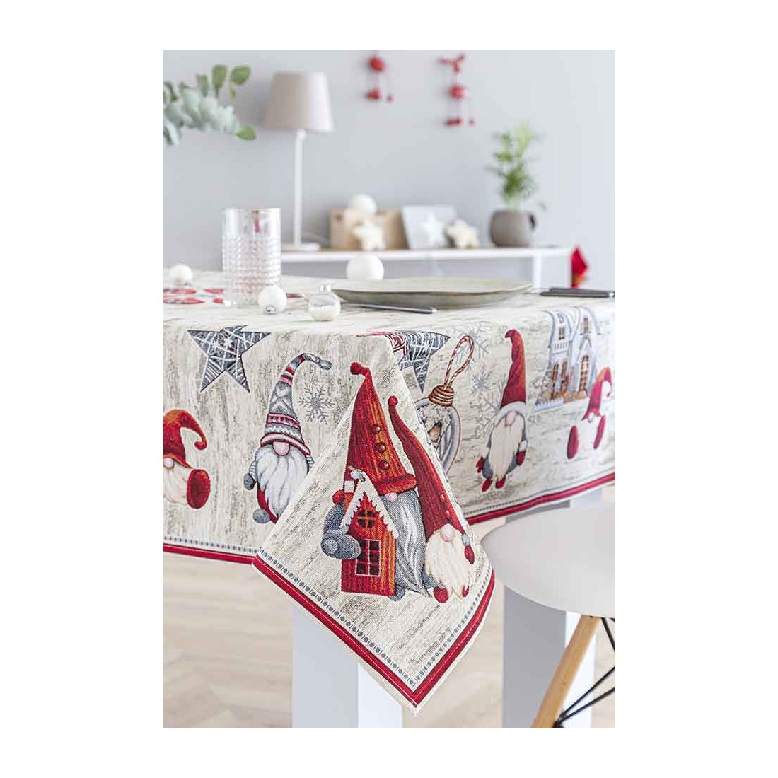 Mantel de tejido jacquard con motivos de gnomos navideños en tonalidades gris y rojo.