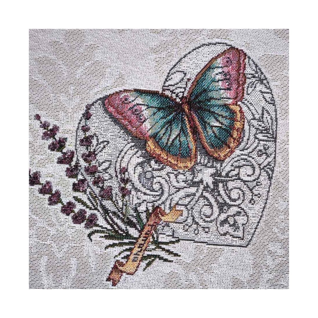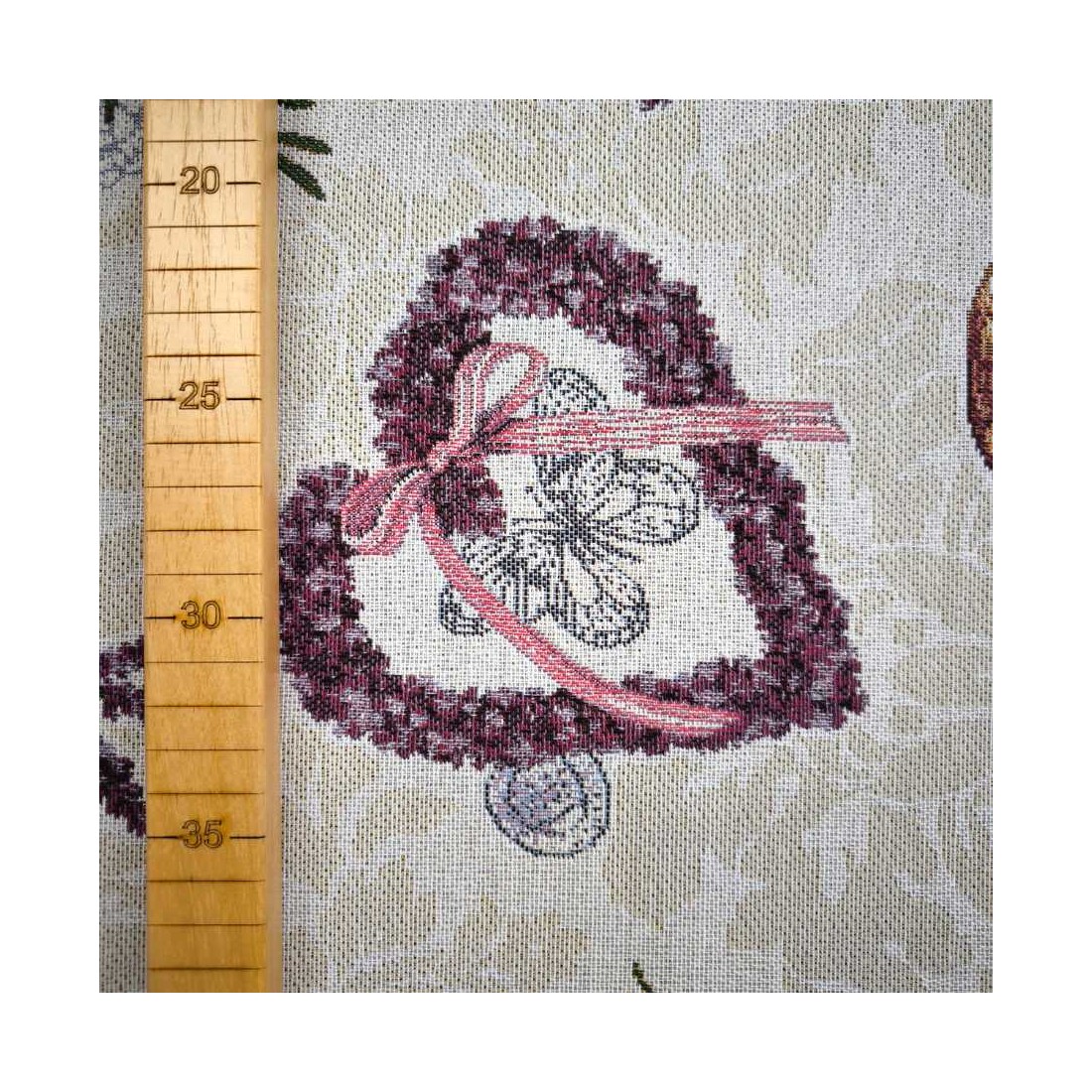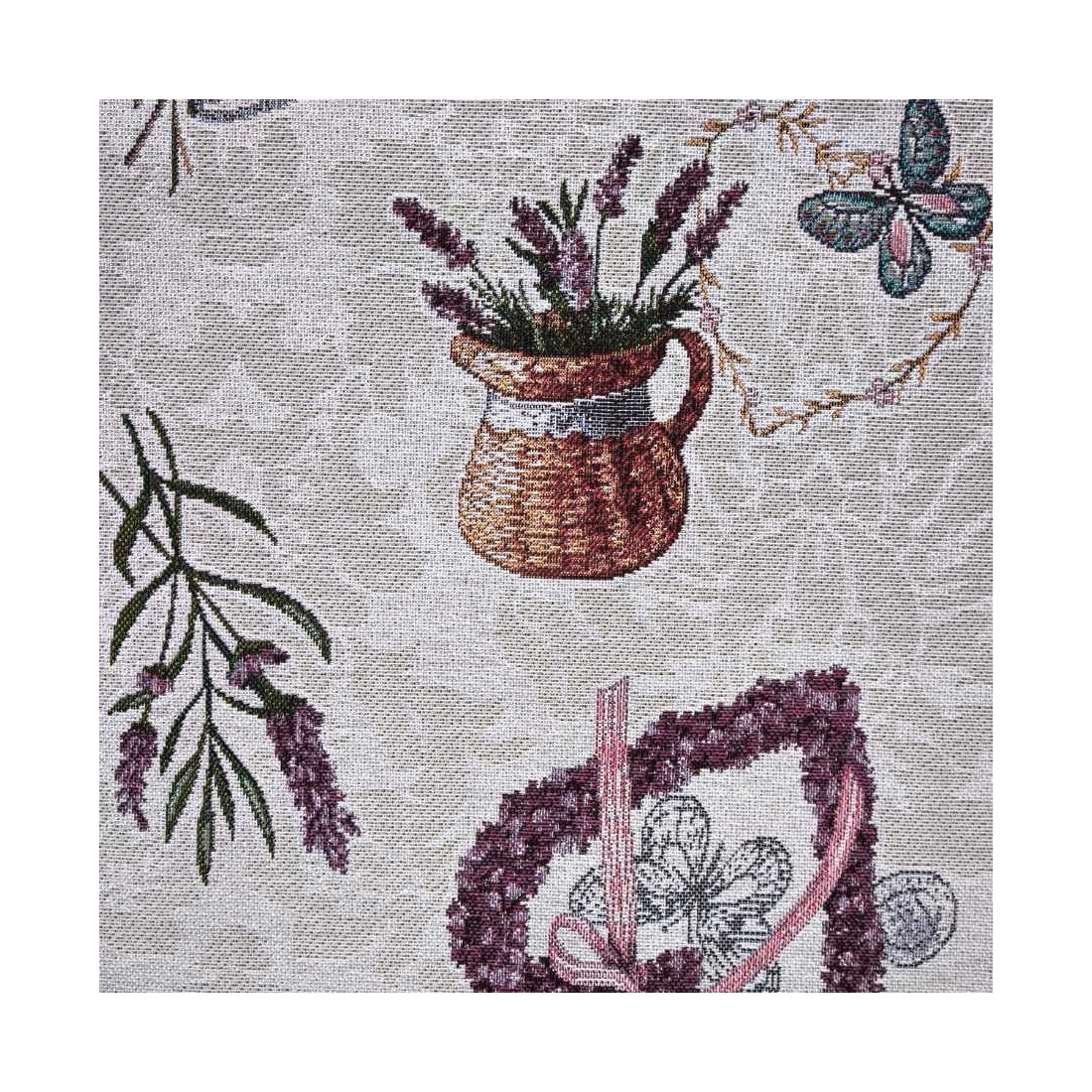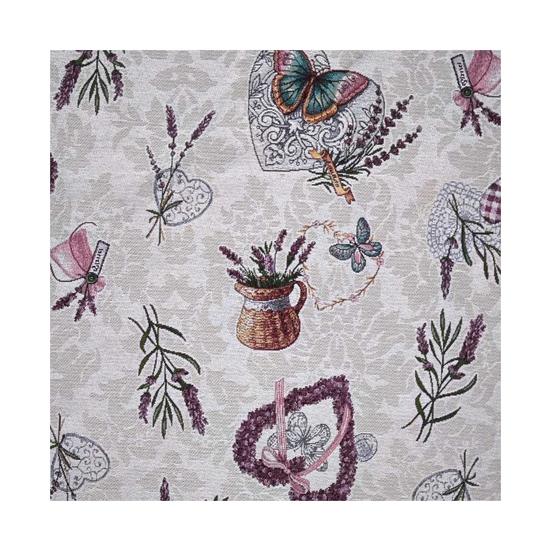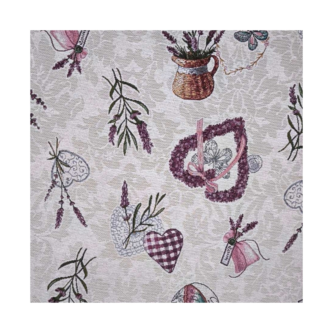 Tejido Jacquard a metros inspirado en los campos de Provenza con flores de lavanda, jarrones y corazones en tonos morados. Los matices de violeta y verde fresco combinarán perfectamente con tonos pastel o tejidos con sutiles motivos florales. Fondo blanco. LAVANDER.