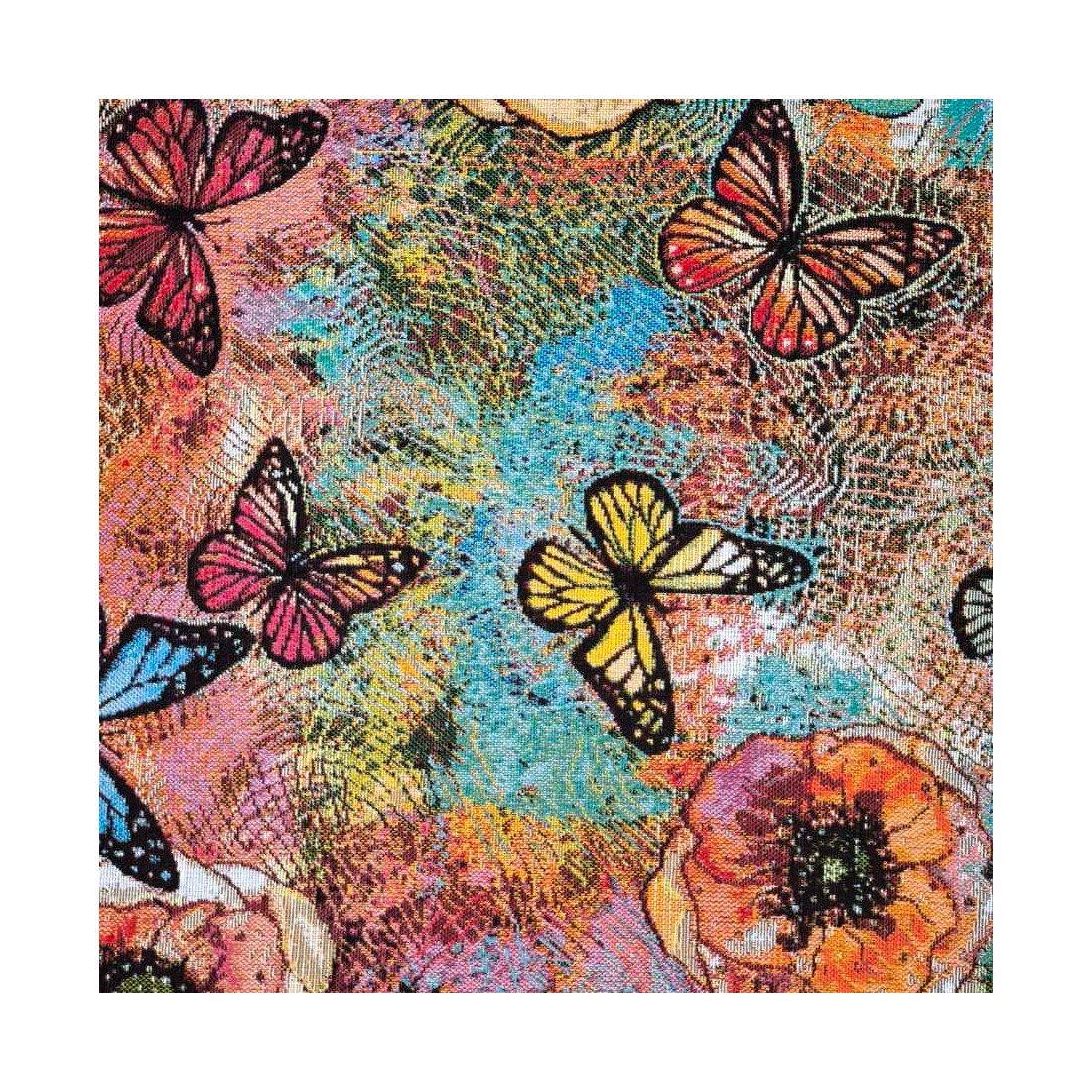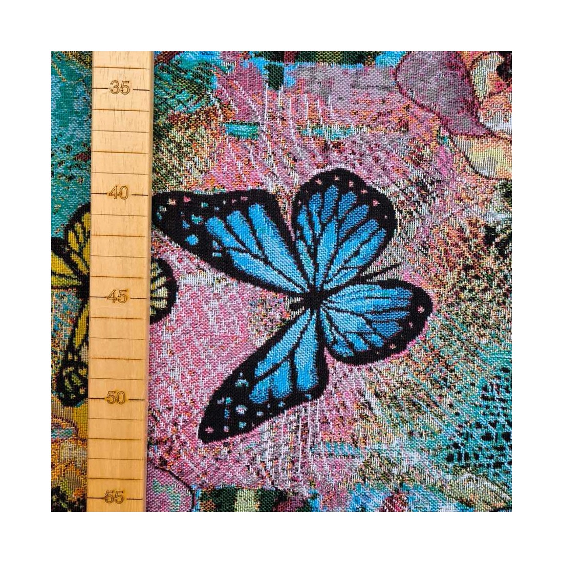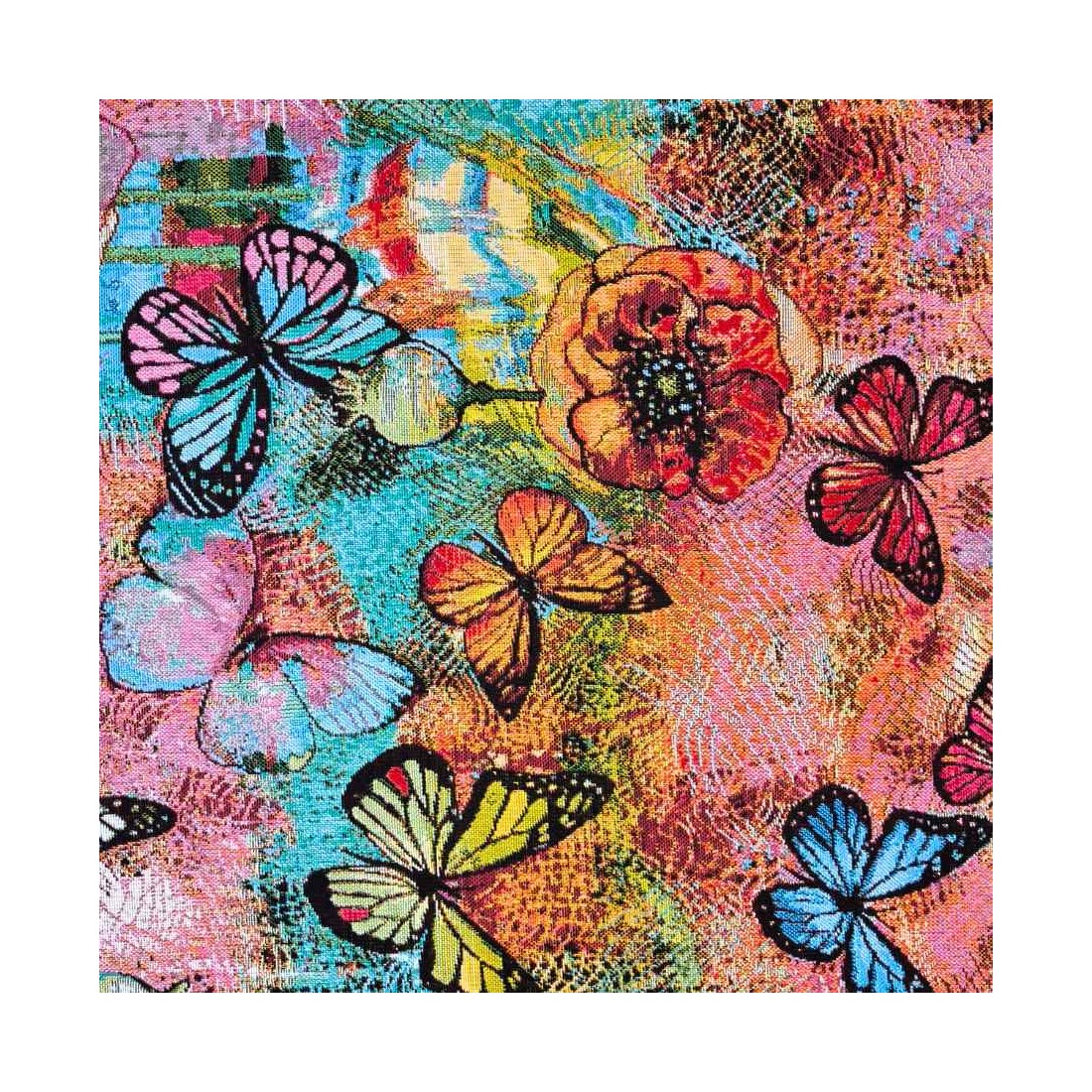 Tejido Jacquard con mariposas y flores de diferente colores como amarillas, naranjas y fondo azul AQUAMARINA. Composición: 60% Poliéster, 40% Algodón. Unidad de compra: metros de tela de 140cms de ancho. Peso: 397 g/m2.