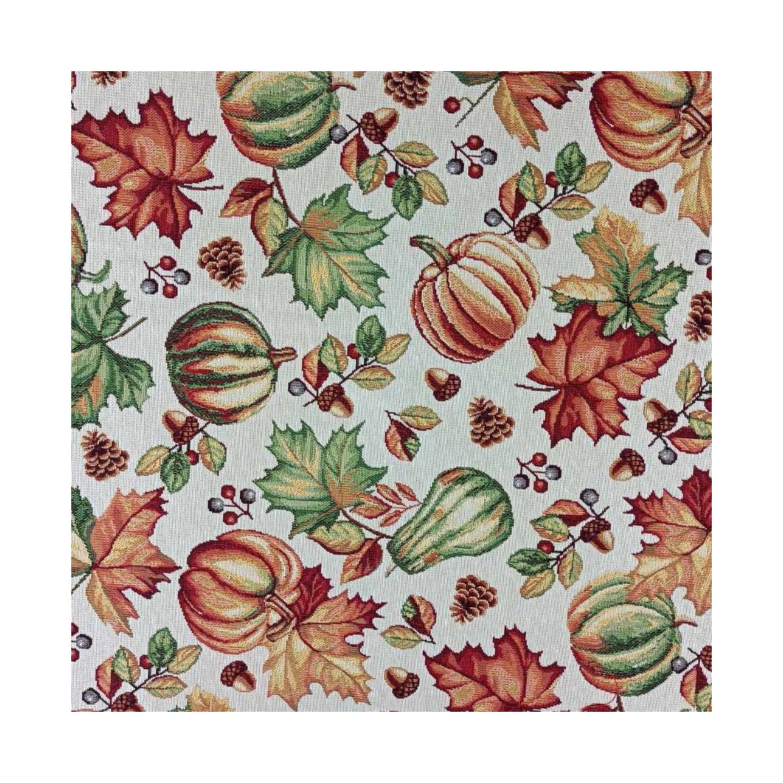 Tejido Jacquard a metros con hojas, calabazas , piñas y motivos otoñales naranjas y verdes. Fondo blanco. AUTUM. Composición: 60% Poliéster, 40% Algodón. Unidad de compra: metros de tela de 140cms de ancho. Peso: 397 g/m2.