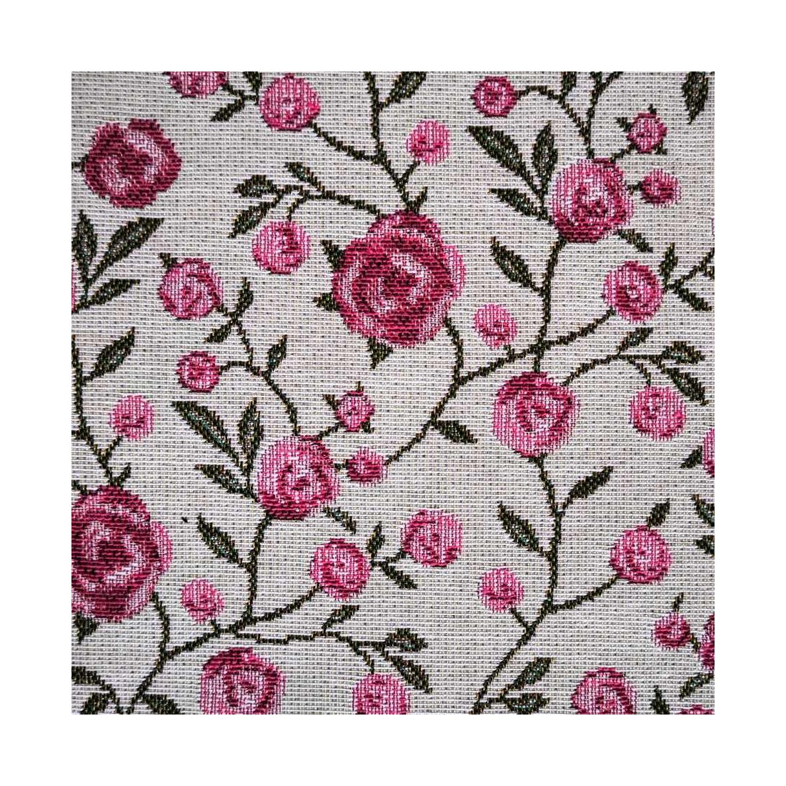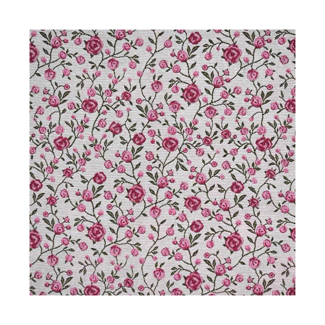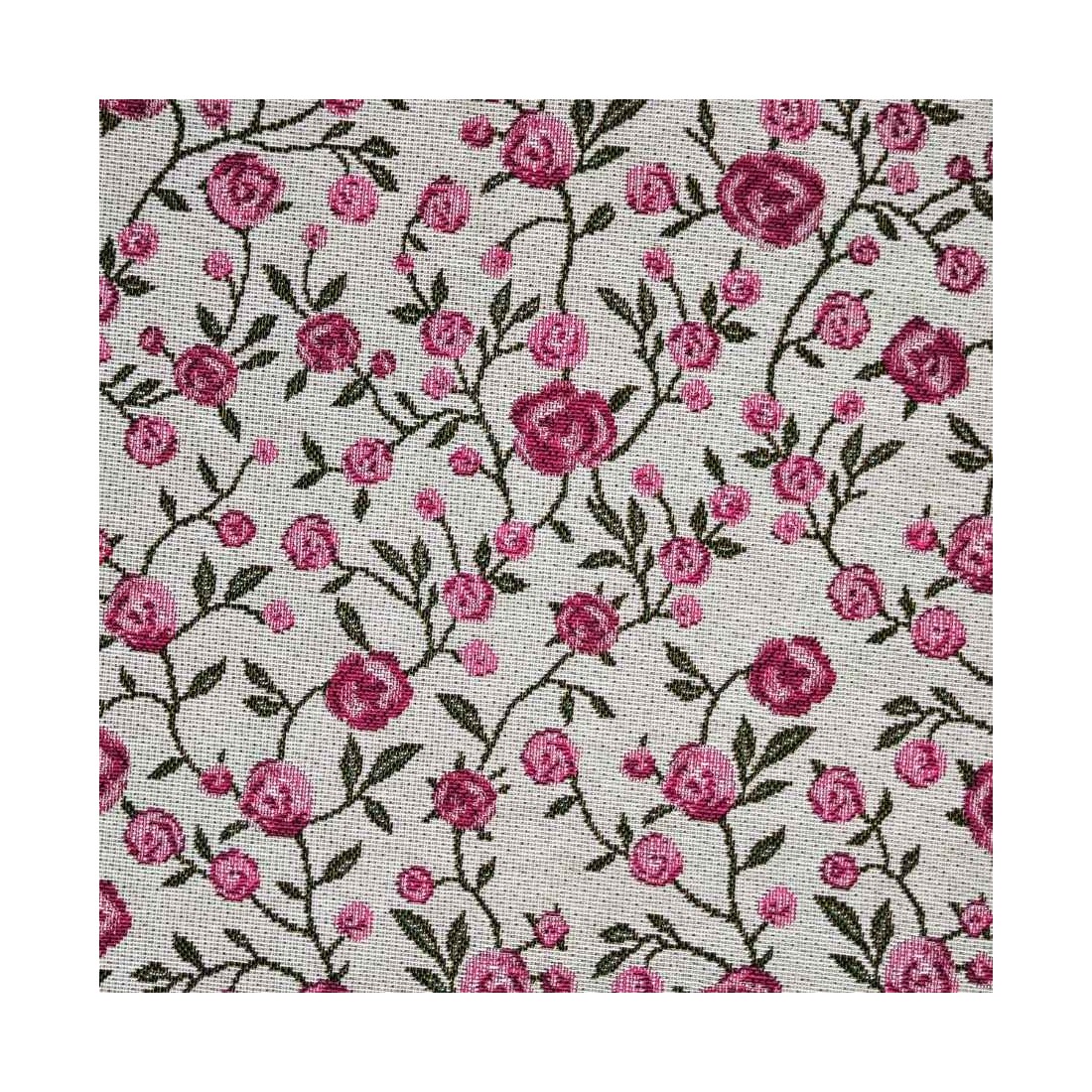 Tejido Jacquard a metros con flores rosas y hojitas verdes. Fondo blanco. WINS. Composición: 60% Poliéster, 40% Algodón. Unidad de compra: metros de tela de 140cms de ancho. Peso: 397 g/m2.