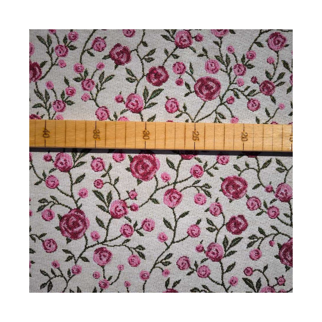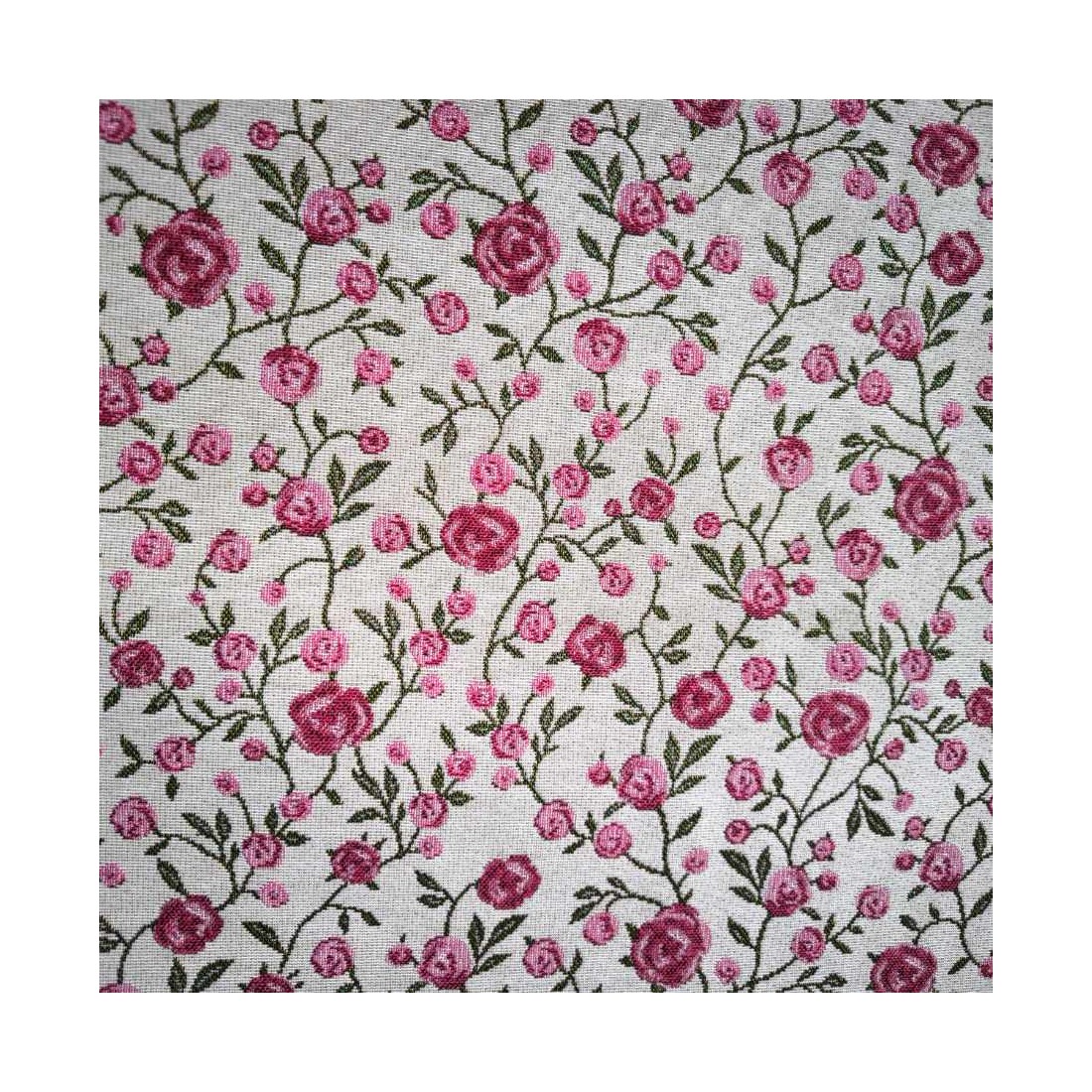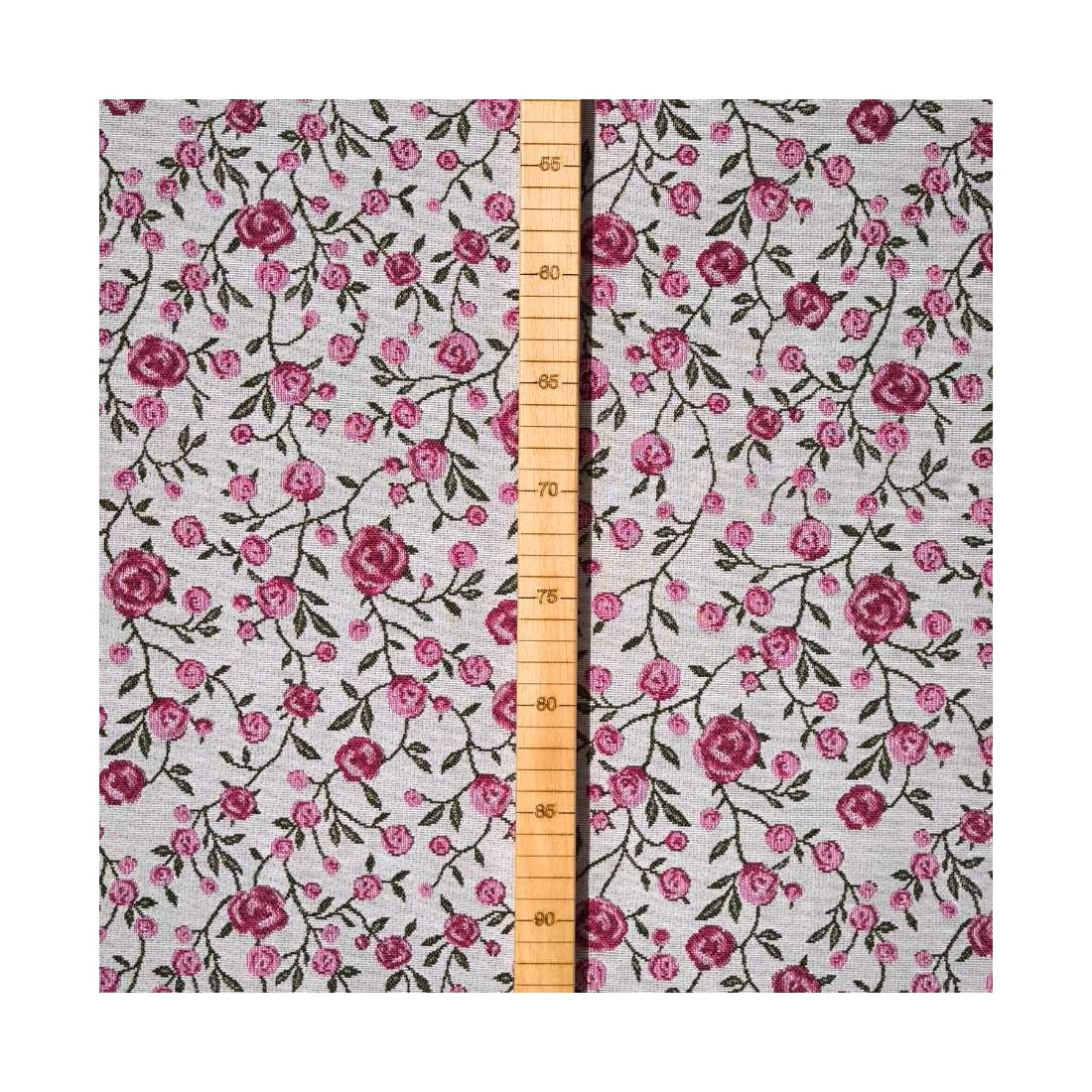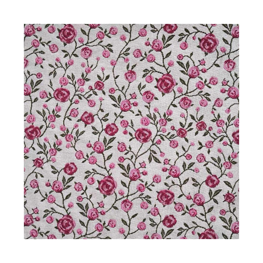 Tejido Jacquard a metros con flores rosas y hojitas verdes. Fondo blanco. WINS. Composición: 60% Poliéster, 40% Algodón. Unidad de compra: metros de tela de 140cms de ancho. Peso: 397 g/m2.